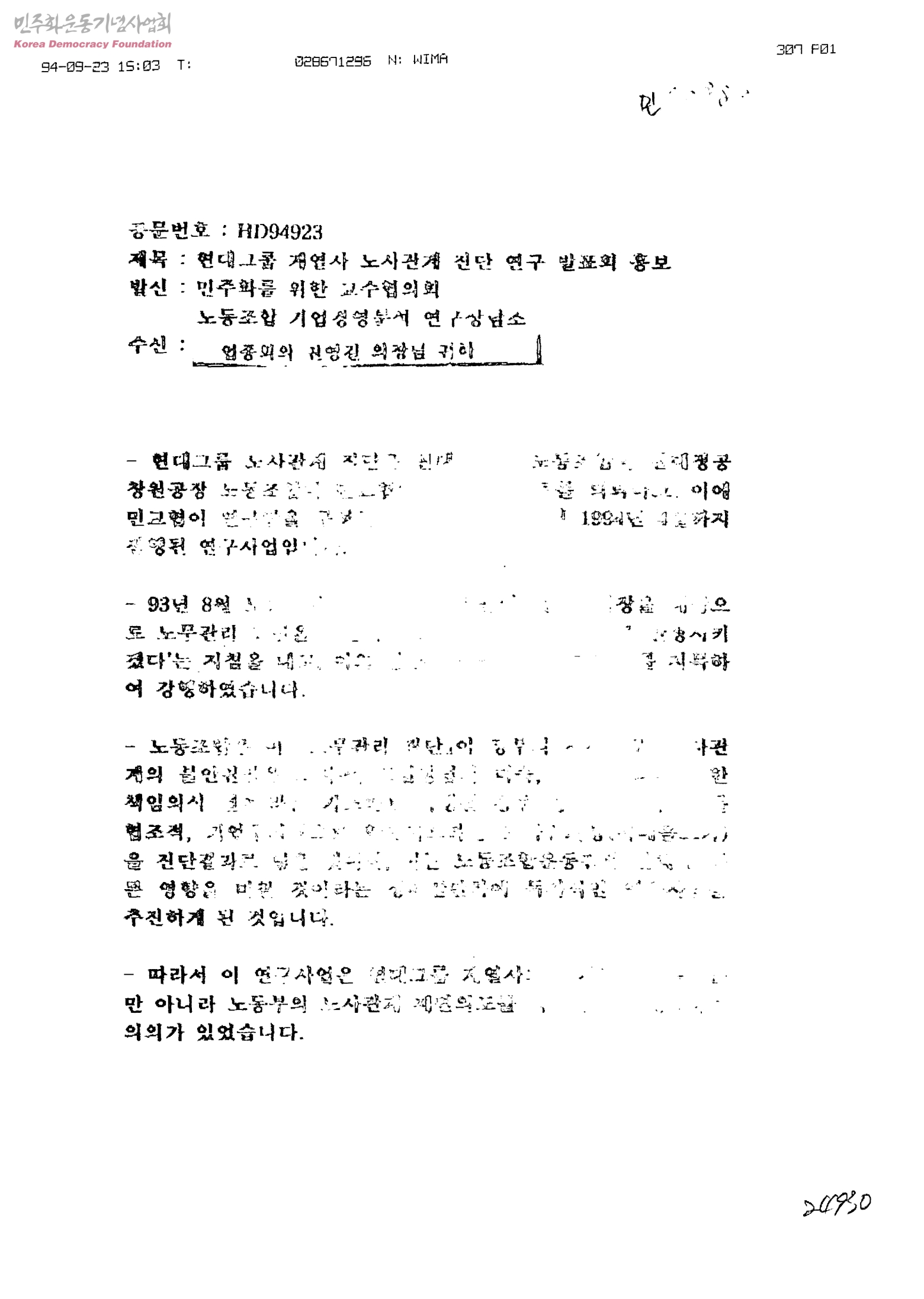 현대그룹 계열사 노사관계 진단 연구 발표회 홍보[수신:업종의의 권영길 의장님 귀하, 발신:민주화를 위한 교수협의회, 노동조합 기업경영분석 연구상담소]