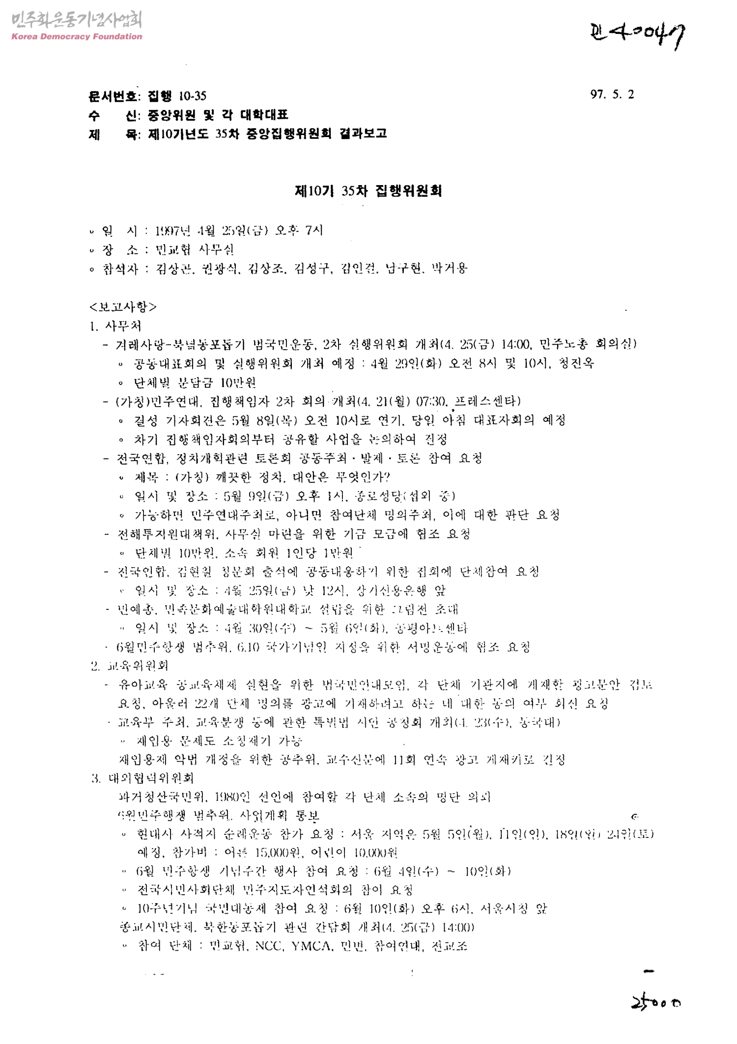 제10기년도 35차 중앙집행위원회 결과보고[수신:중앙위원및각대학대표]
