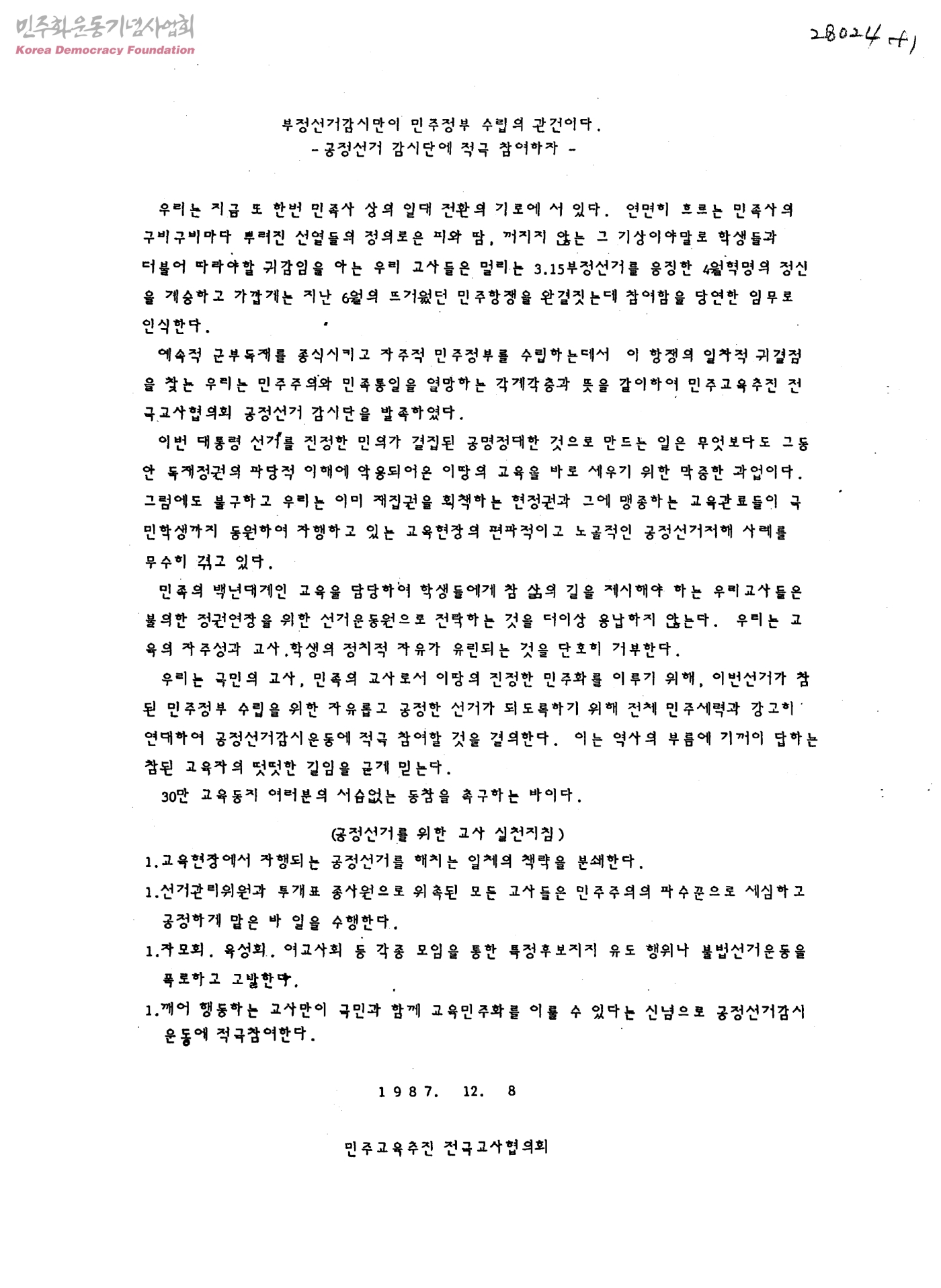 부정선거감시만이 민주정부 수립의 관건이다-공정선거 감시단에 적극 참여하자