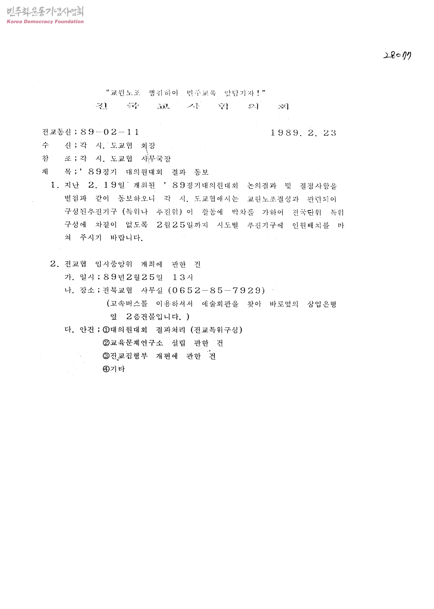 89정기 대의원대회 결과 통보[수신:각 시.도교협 회장, 발신:전국교사협의회]
