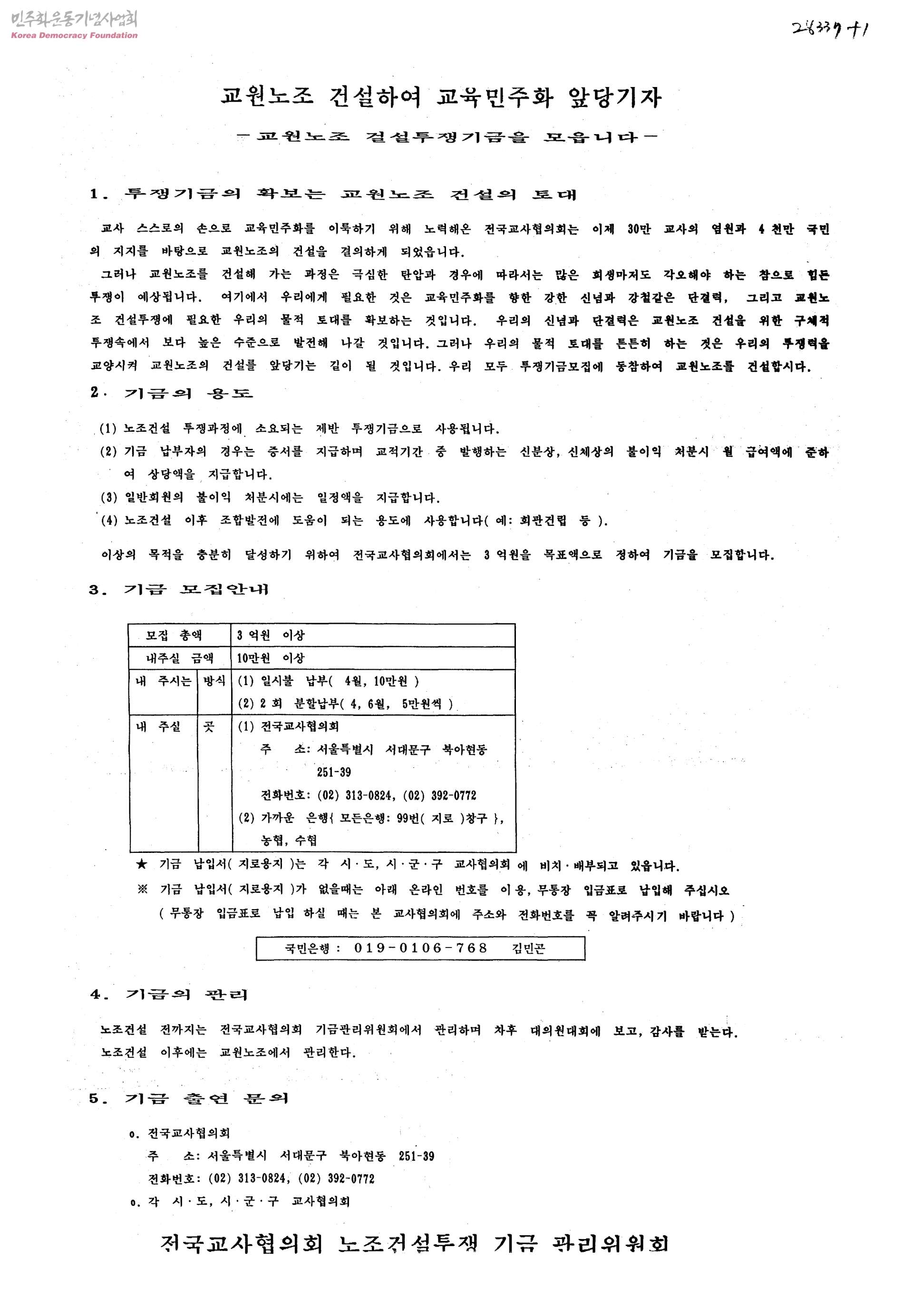 교원노조 건설하여 교육민주화 앞당기자-교원노조 건설투쟁기금을 모읍니다