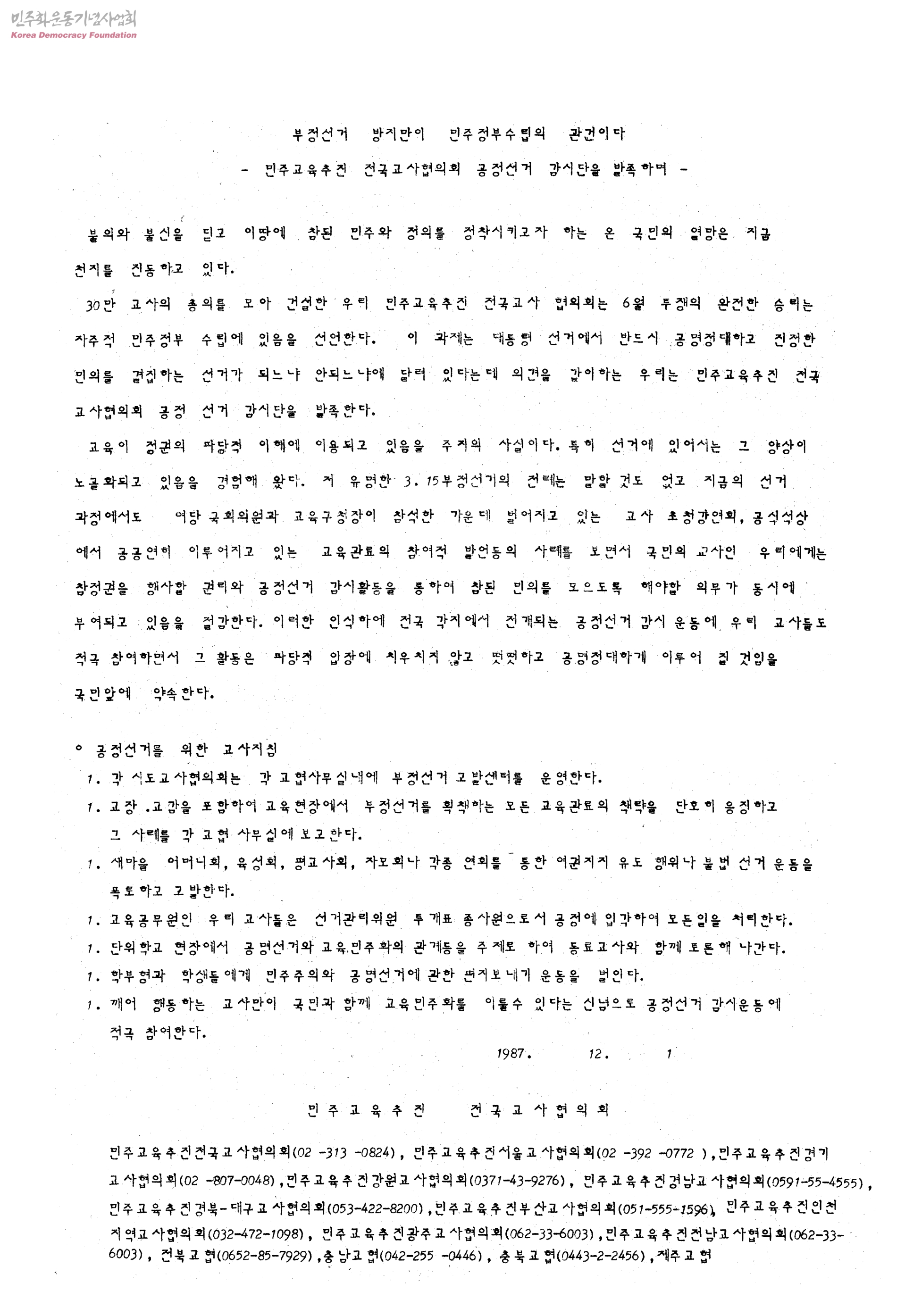 부정선거 방지만이 민주정부수립의 관건이다-민주교육추진 전국교사협의회 공정선거 감시단을 발족하며