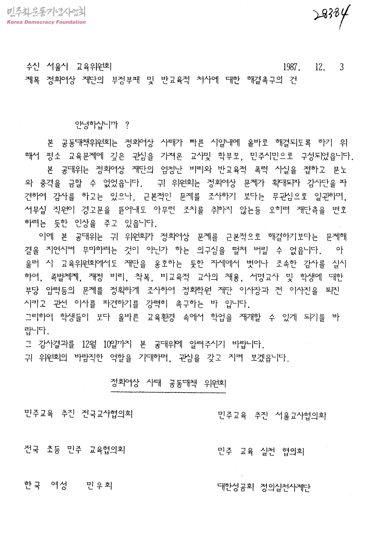 정화여상 재단의 부정부패 및 반교육적 처사에 대한 해결촉구의 건[수신:서울시 교육위원회, 발신:정화여상사태공동대책위원회]