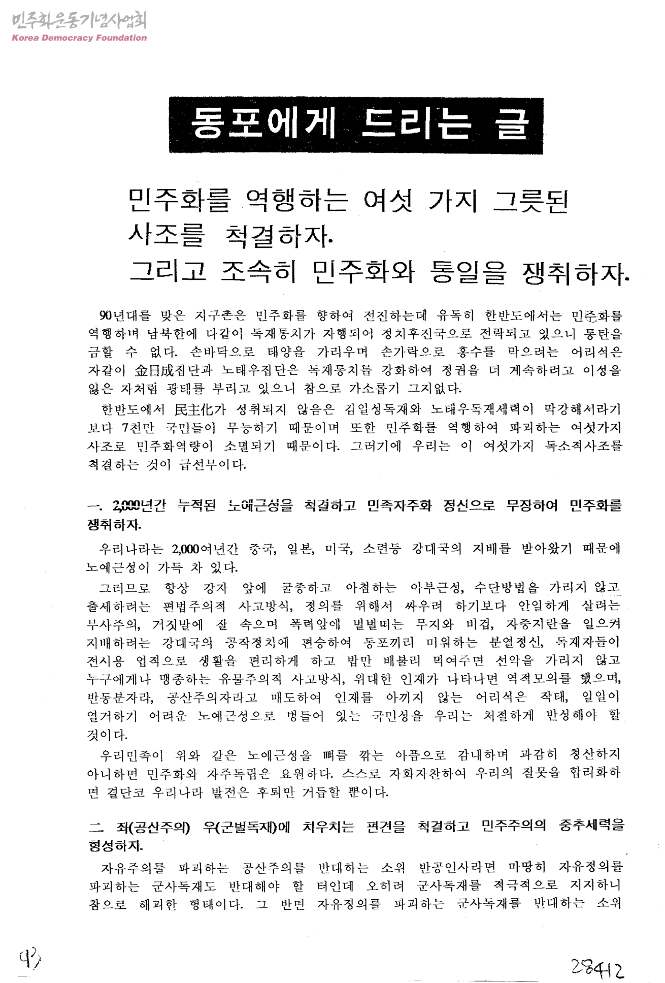 동포에게 드리는 글-민주화를 역행하는 여섯 가지 그릇된 사조를 척결하자. 그리고 조속히 민주화와 통일을 쟁취하자.