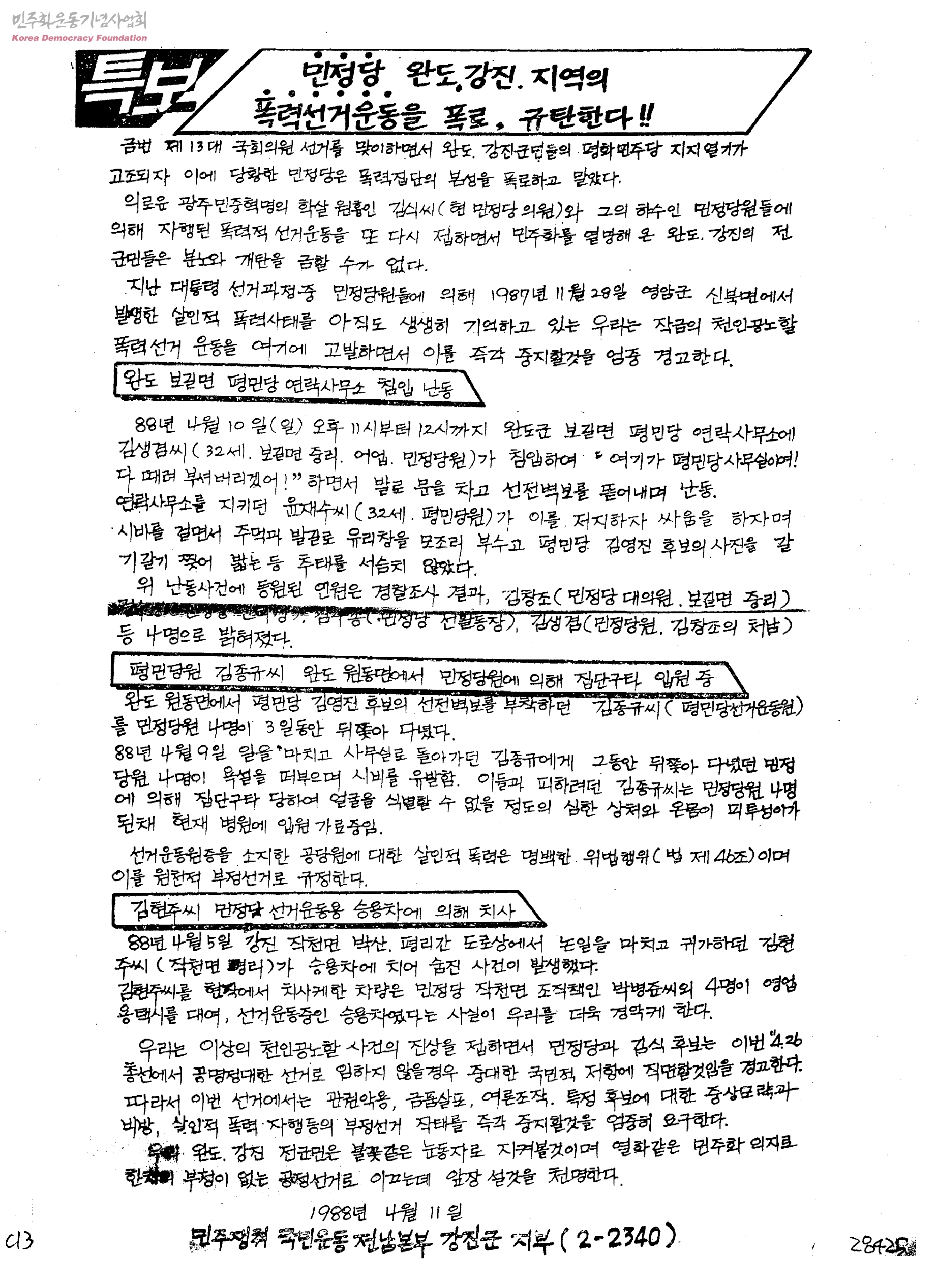특보-민정당 완도.강진 지역의 폭력선거운동을 폭로, 규탄한다!!