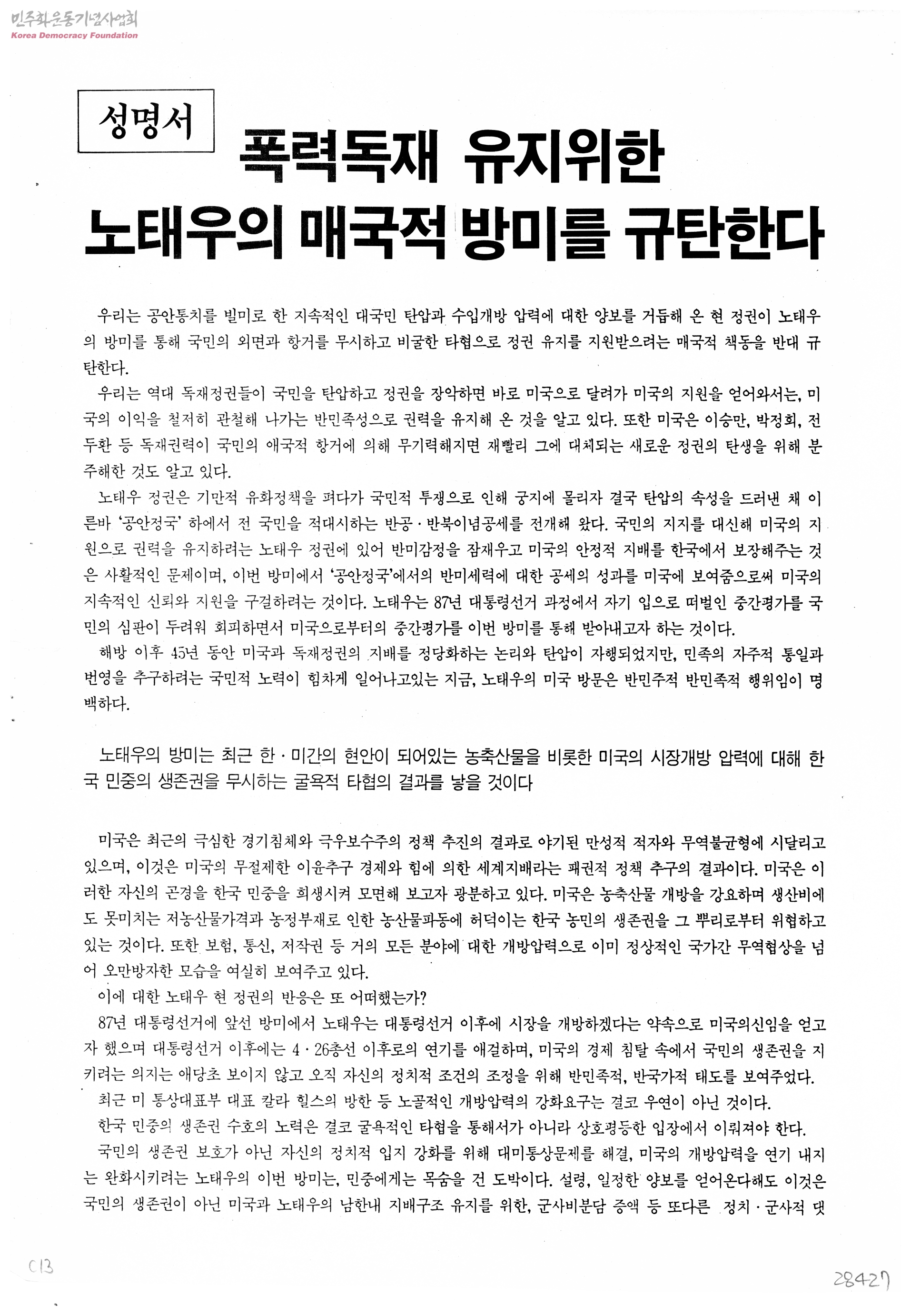 폭력독재 유지위한 노태우의 매국적 방미를 규탄한다.