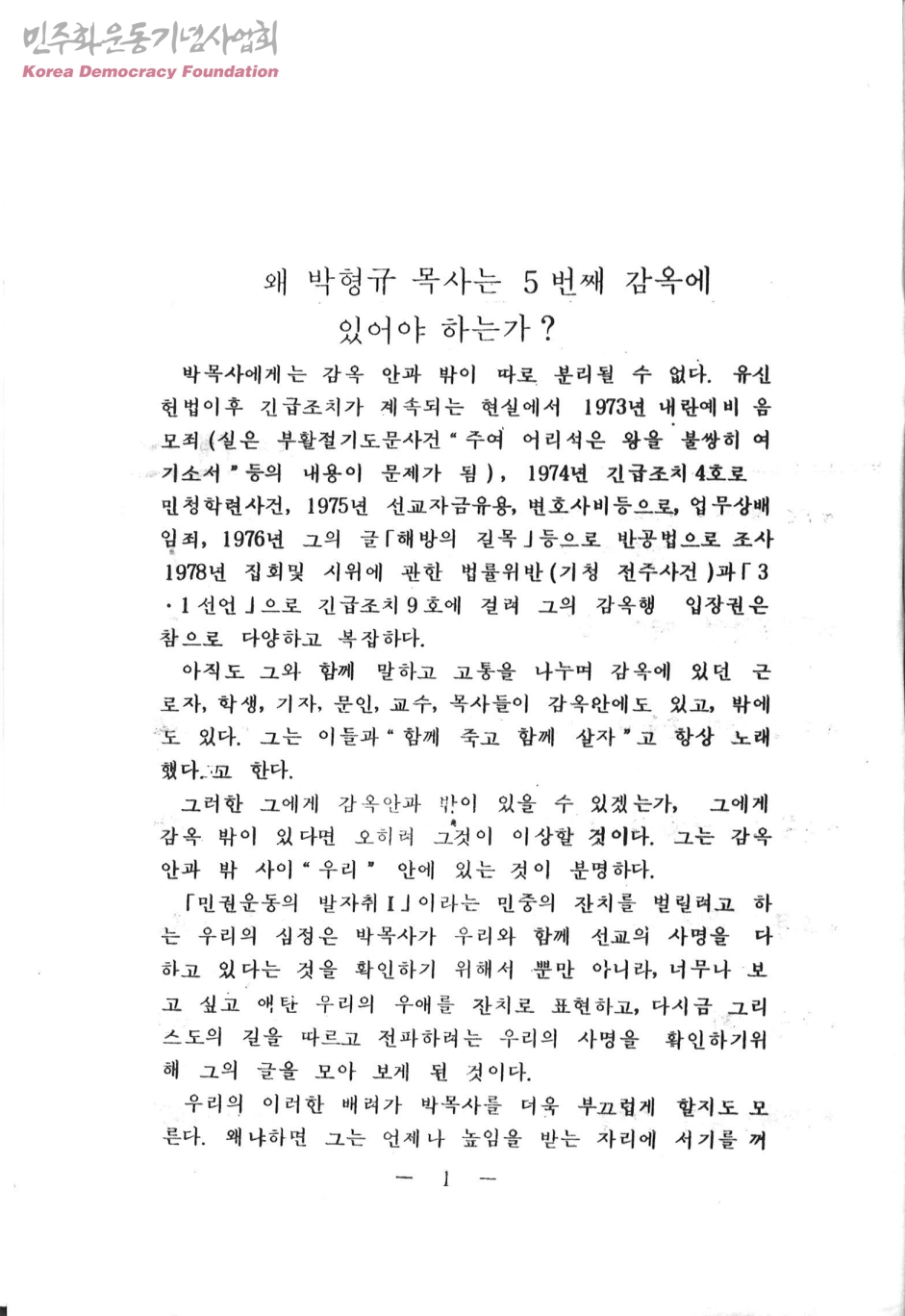 - · 왜 박형규 목사는 5번째 감옥에 있어야 하는가? · 출옥 인사 · 묶인 손들의 기도 · 어머니 · 구원과 해방 · 맑시스트와 크리스챤 대화의 문제점 · 박형규 목사의 옥중편지 · 이력서