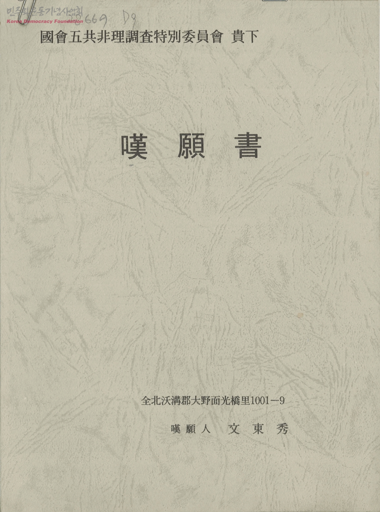嘆願書[수신:國會五共非理調査特別委圓會, 발신:嘆願人 文東秀]