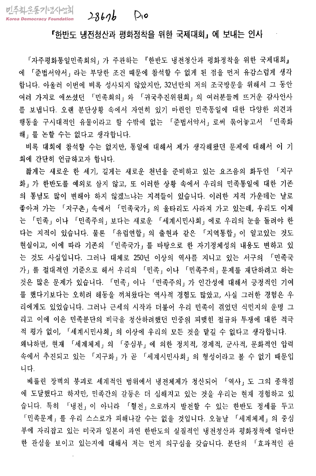 한반도 냉전청산과 평화정착을 위한 국제대회에 보내는 인사
