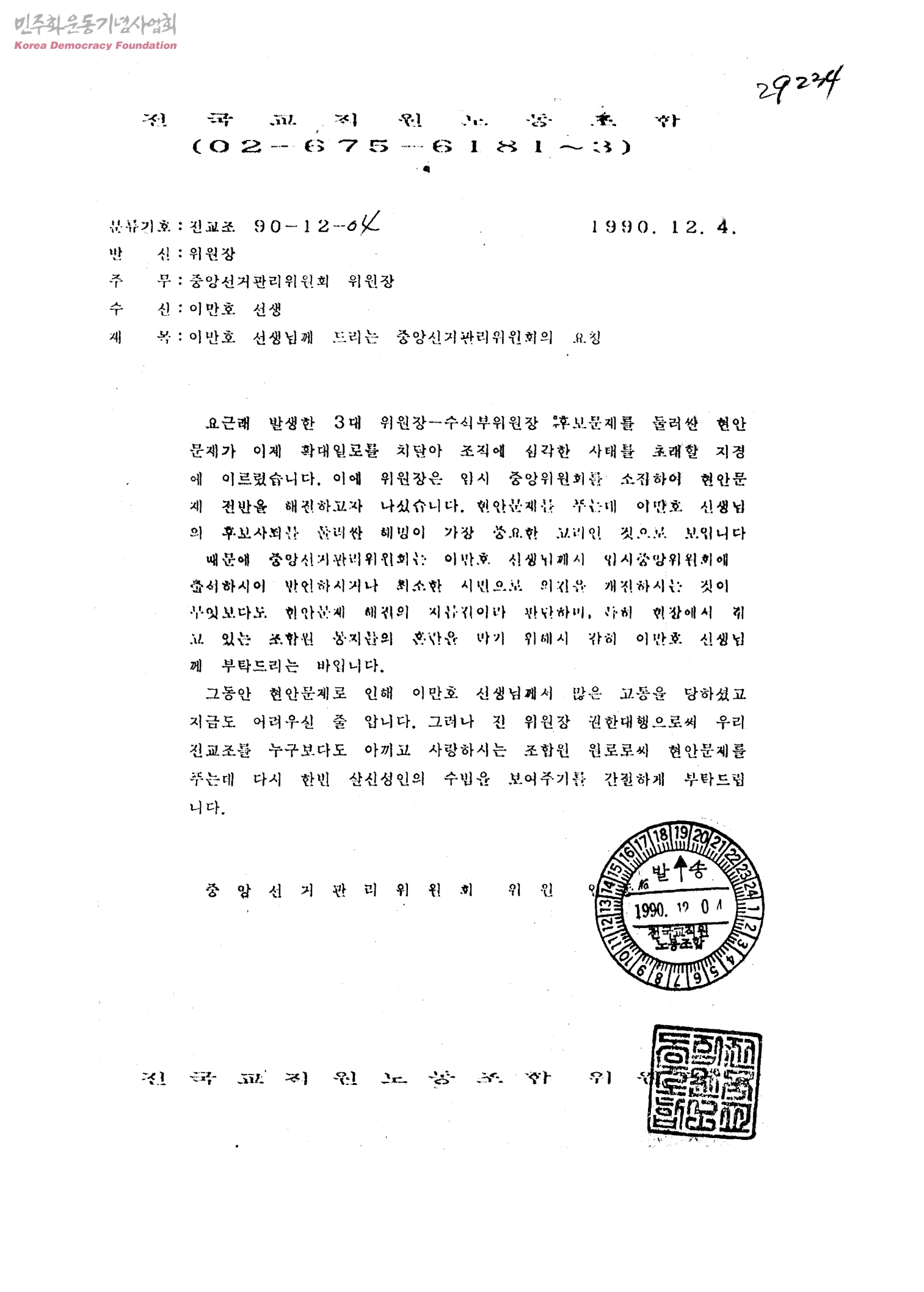 이만호 선생님께 드리는 중앙선거관리위원회의 요청[수신:이만호 선생, 발신:전국교직원노동조합]