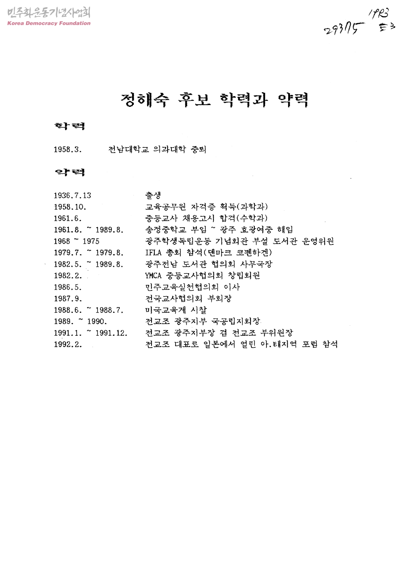 정해숙 후보 학력과 약력