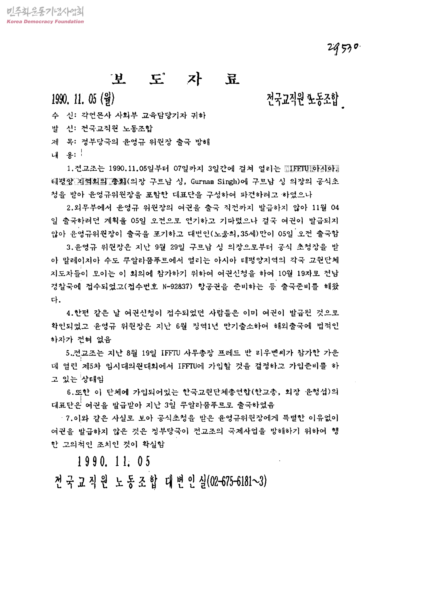 보도자료-정부당국의 윤영규 위원장 출국 방해[수신:각언론사 사회부 교육담당기자, 발신:전국교직원노동조합]