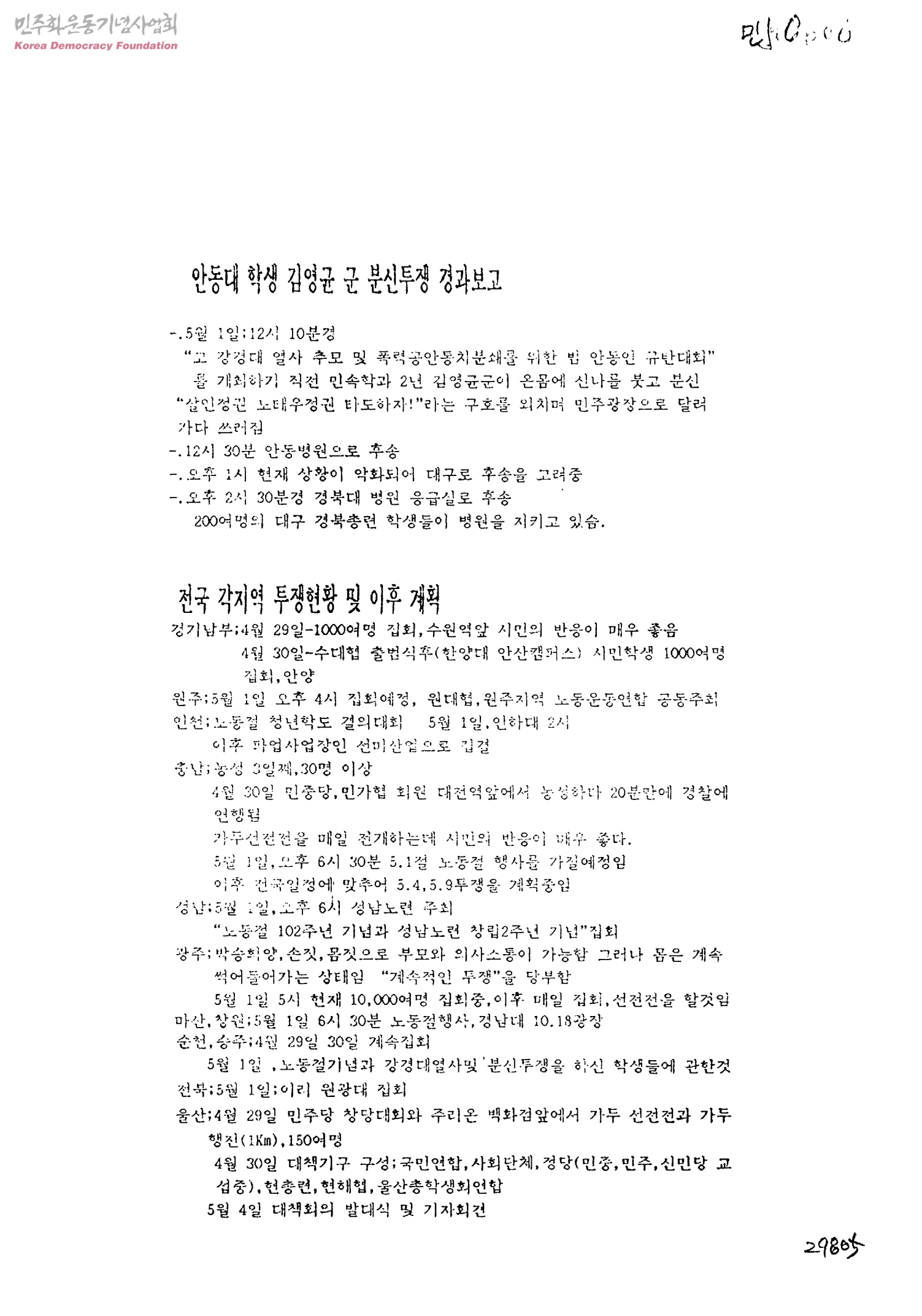 안동대 학생 김영균 군 분신투쟁 경과보고