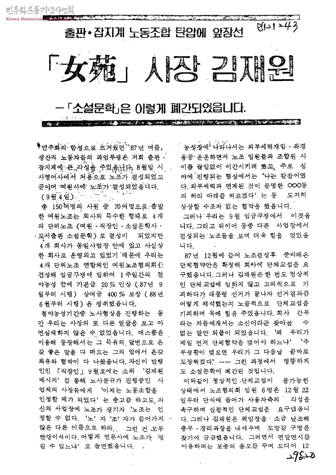 출판·잡지계 노동조합 탄압에 앞장선 女苑 사장 김재원-「소설문학」은 이렇게 폐간되었습니다