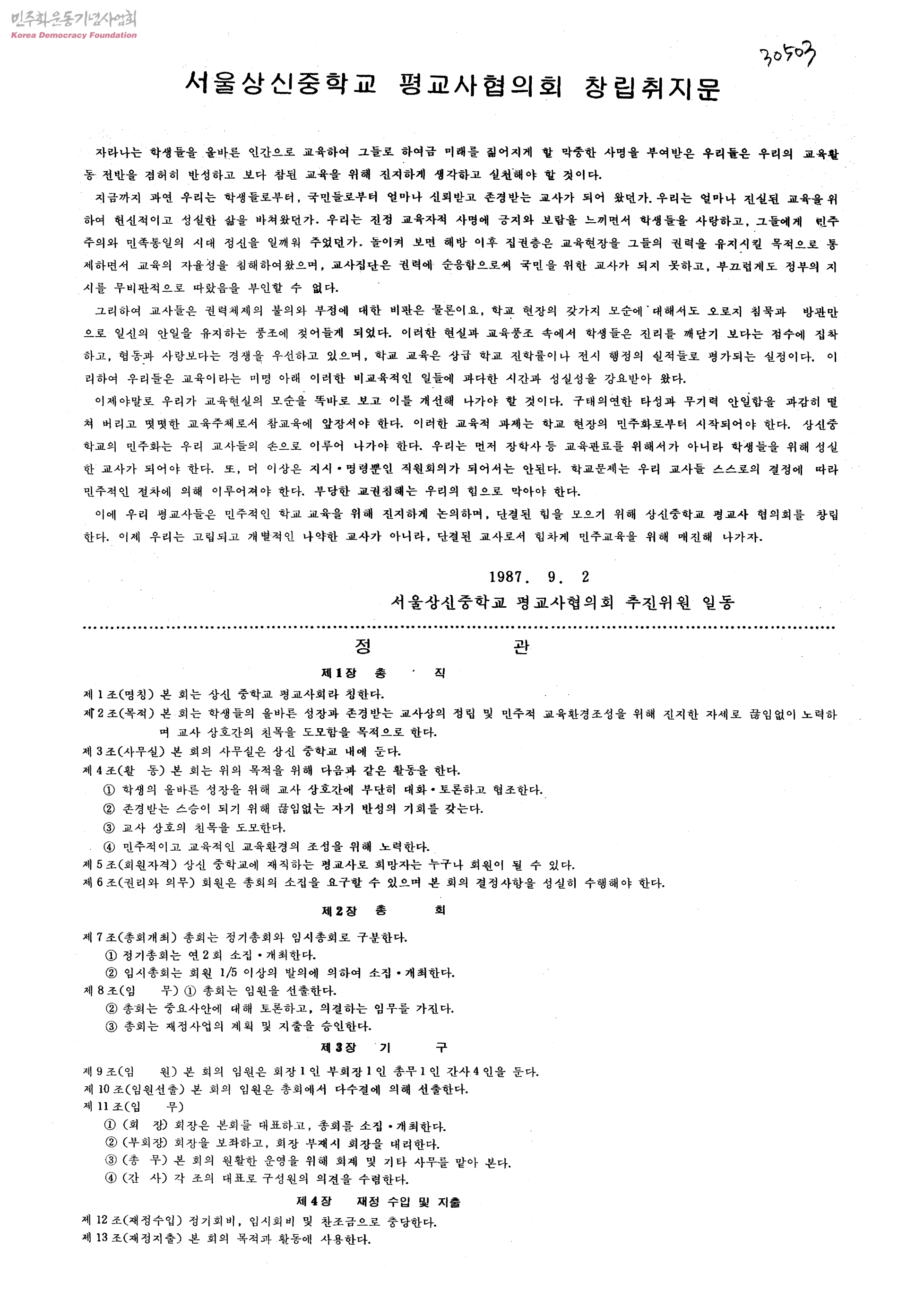 서울상신중학교 평교사협의회 창립취지문
