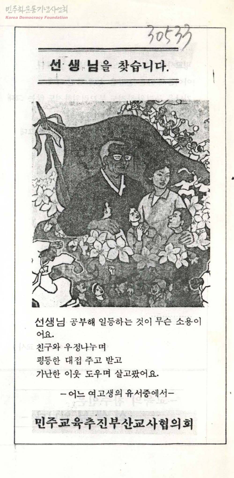 - 학교는 민주주의의 산실이 되어야 합니다. 교사는 정당한 대우를 받아야 합니다. 여론은 이렇게 말하고 있습니다. 등의 내용