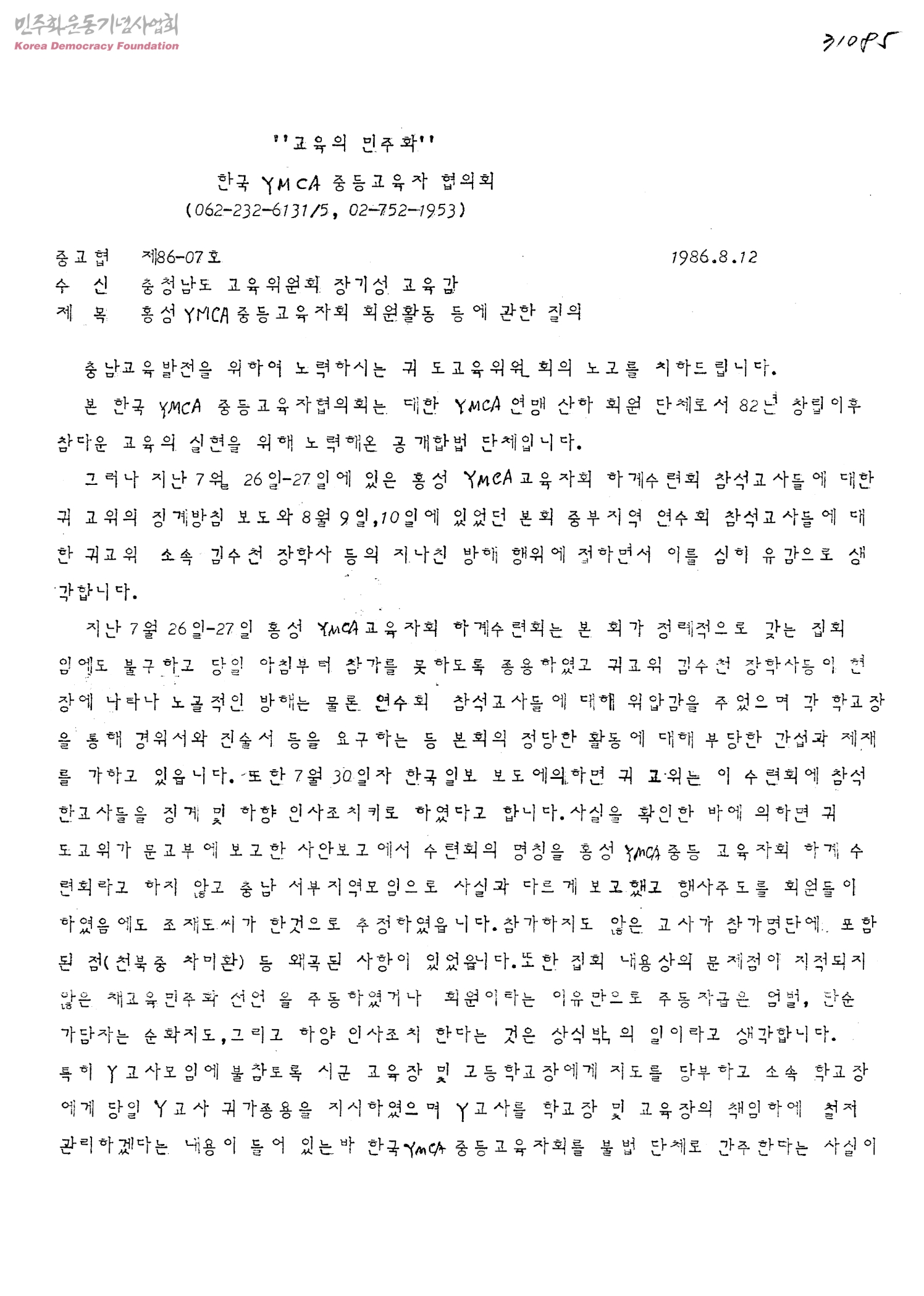 홍성 YMCA 중등교육자회 회원활동 등에 관한 질의[수신:충청남도 교육위원회 장기성 교육감, 발신:한국 YMCA 중등교육자 협의회]