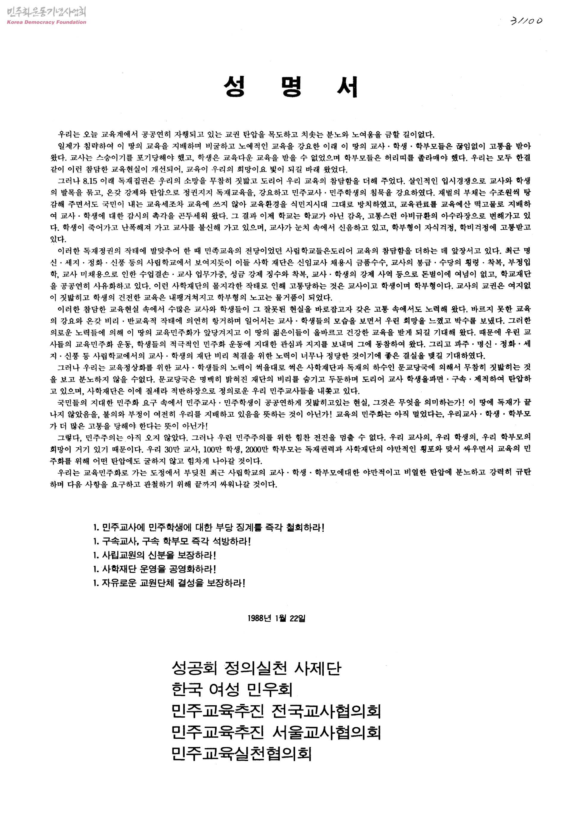 성명서[교사.학생에 대한 부당징계 즉각철회와 사립학교 민주화, 교원단체 결성 보장 요구 관련]