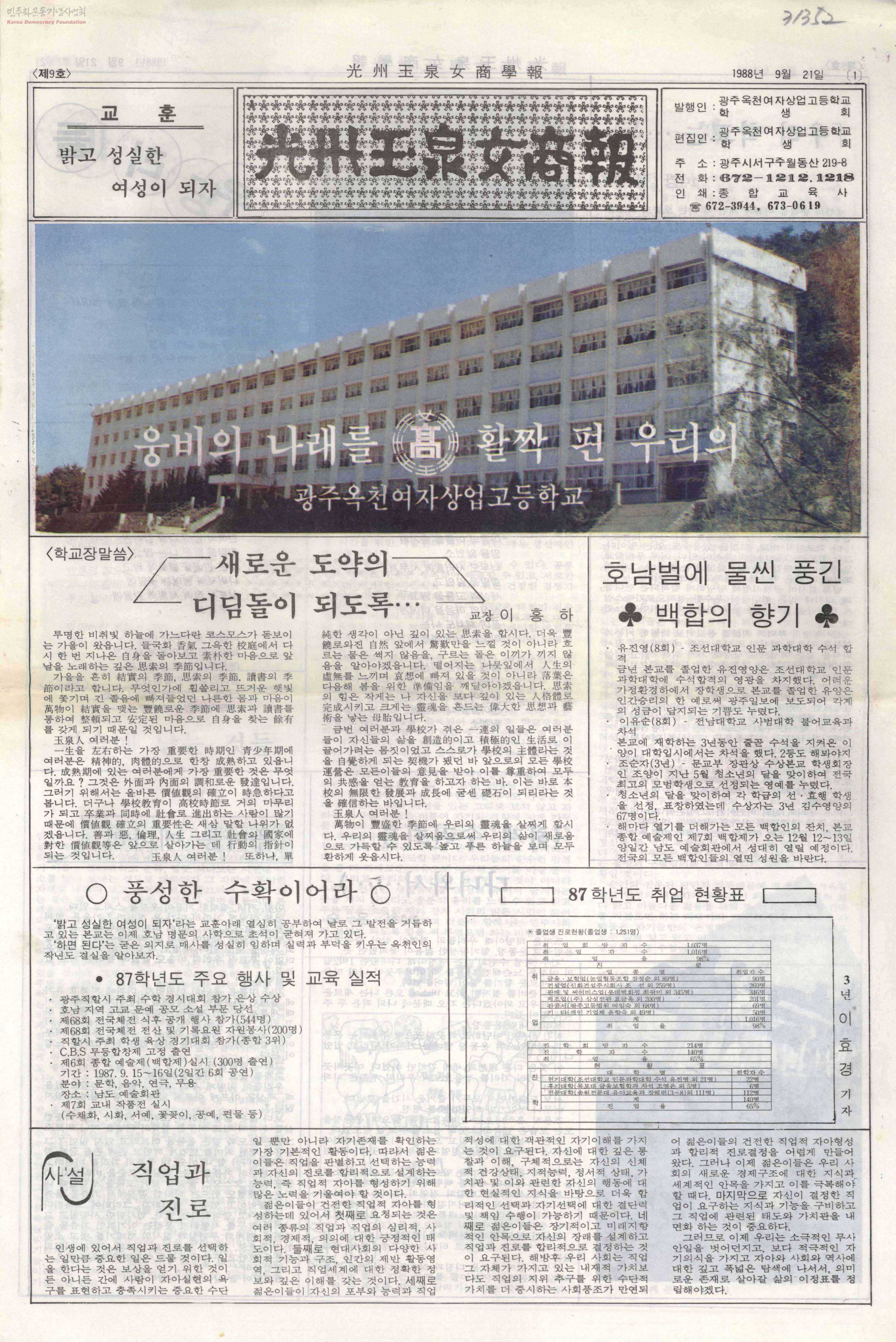 - *80년대 교육민주화 운동의 영향에 따라 학생의 자체적인 활동상을 보여주는 내용. -새로운 도약의 디딤돌이 되도록 -호남벌에 물씬 풍긴 백합의 향기 등