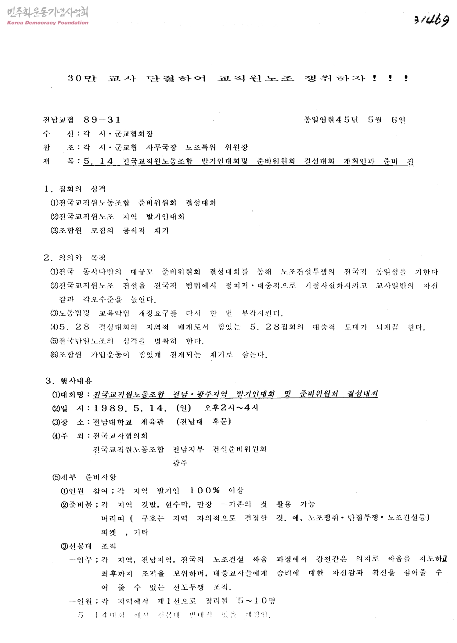 5. 14 전국교직원노동조합 발기인대회 및 준비위원회 결성대회 계획안과 준비 건[수신:각 시·군교협회장, 발신:전남교사협의회]