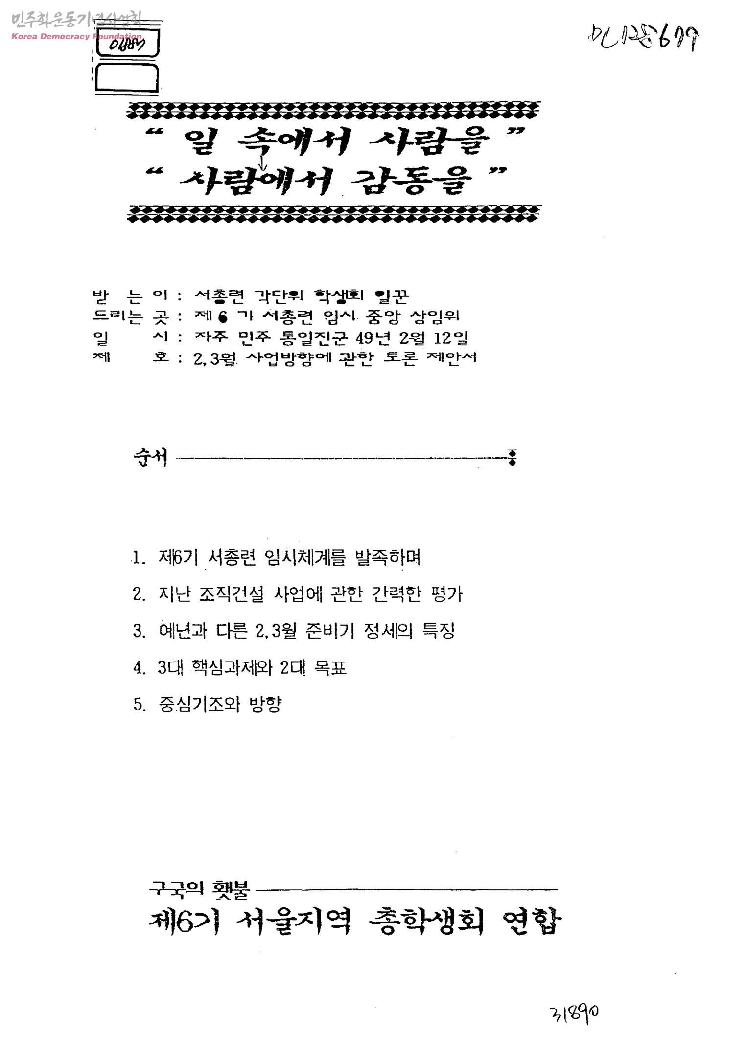 일 속에서 사람을 사람에서 감도을-2,3월 사업방향에 관한 토론 제안서[수신 : 서총련 각단위 학생회 일꾼, 발신:제6기 서총련 임시 중앙 상임위]