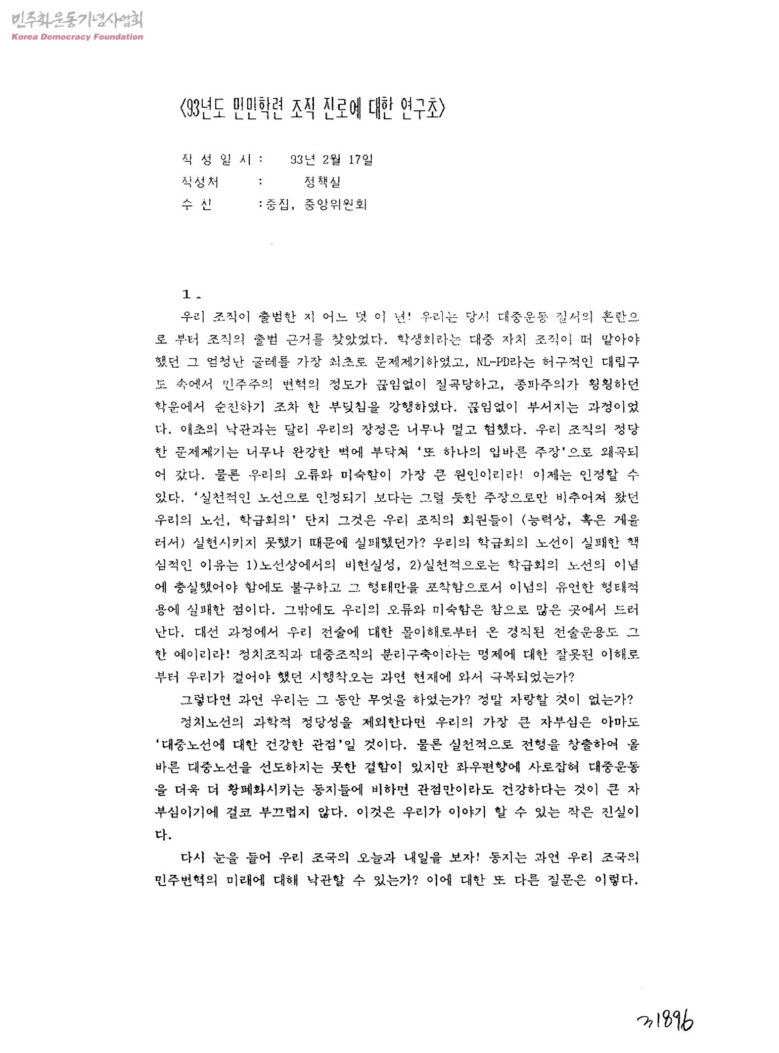 93년도 민민학련 조직 진로에 대한 연구초[수신 : 중집, 중앙위원회, 발신:정책실]
