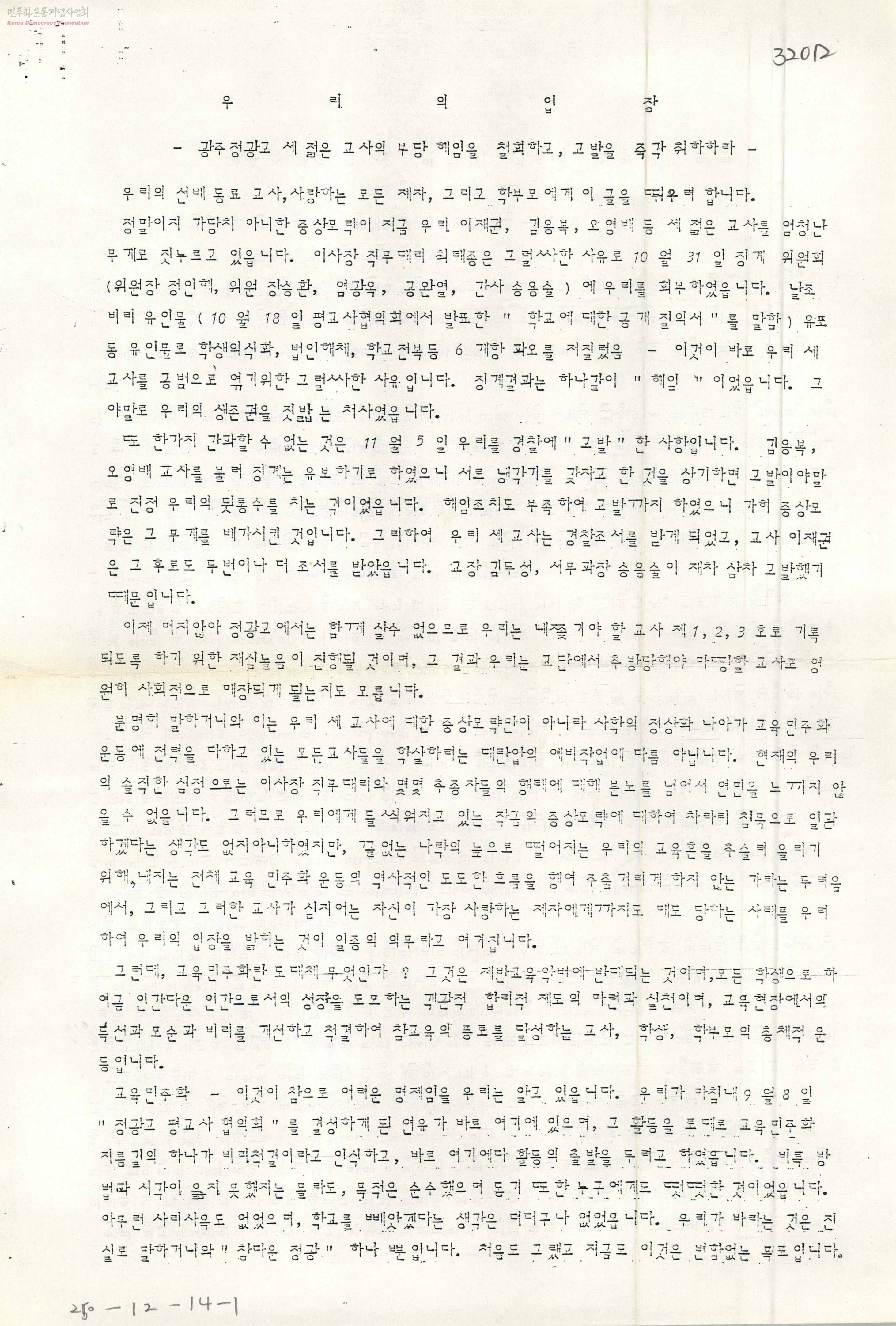우리의 입장-광주 정광고 세 젊은 교사의 부당해임을 철회하고, 고발을 즉각 취하하라