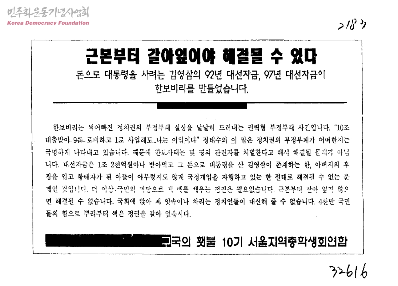 근본부터 갈아엎어야 해결될 수 있다-돈으로 대통령을 사려는 김영삼의 92년 대선자금, 97년 대선자금이 한보비리를 만들었습니다