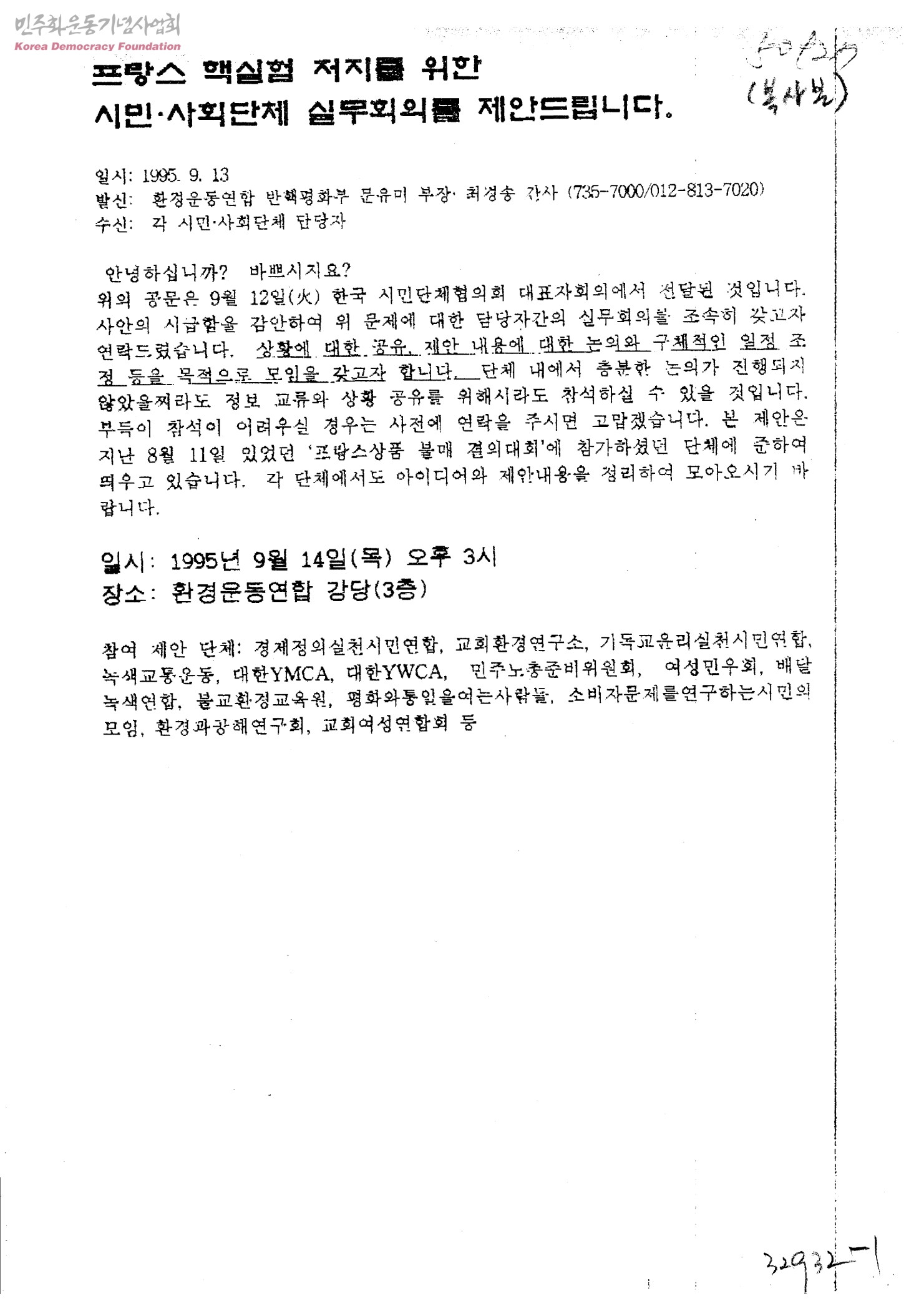 프랑스 핵실험 저지를 위한 시민·사회단체 실무회의를 제안드립니다.[수신:각 시민·사회단체 담당자, 발신:환경운동연합 반핵평화부 문유미 부장 최경송 간사]