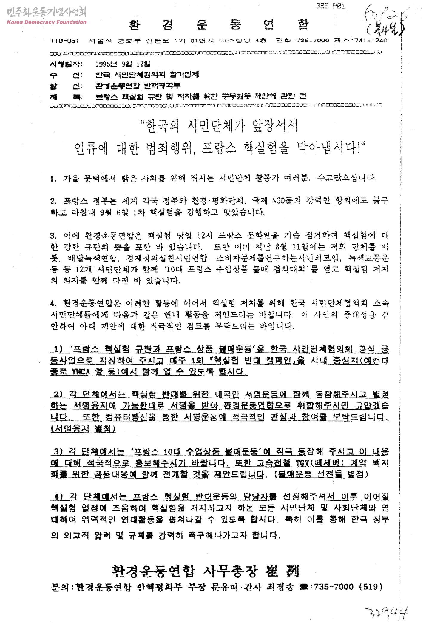 프랑스 핵실험 규탄 및 저지를 위한 공동활동 제안에 관한 건[수신:한국시민단체협의회참가단체, 발신:환경운동연합 반핵평화부]