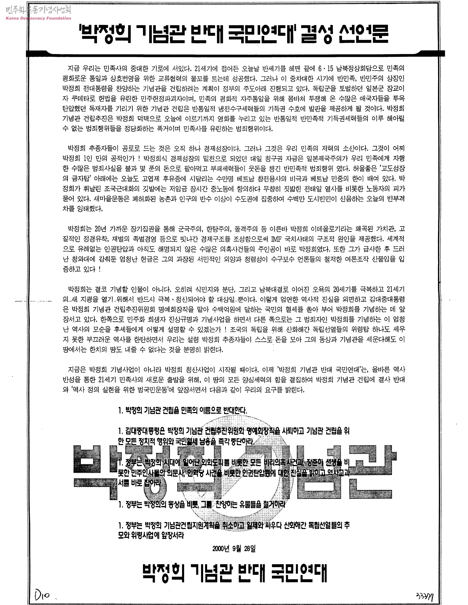 박정희 기념관 반대 국민연대 결성 선언문