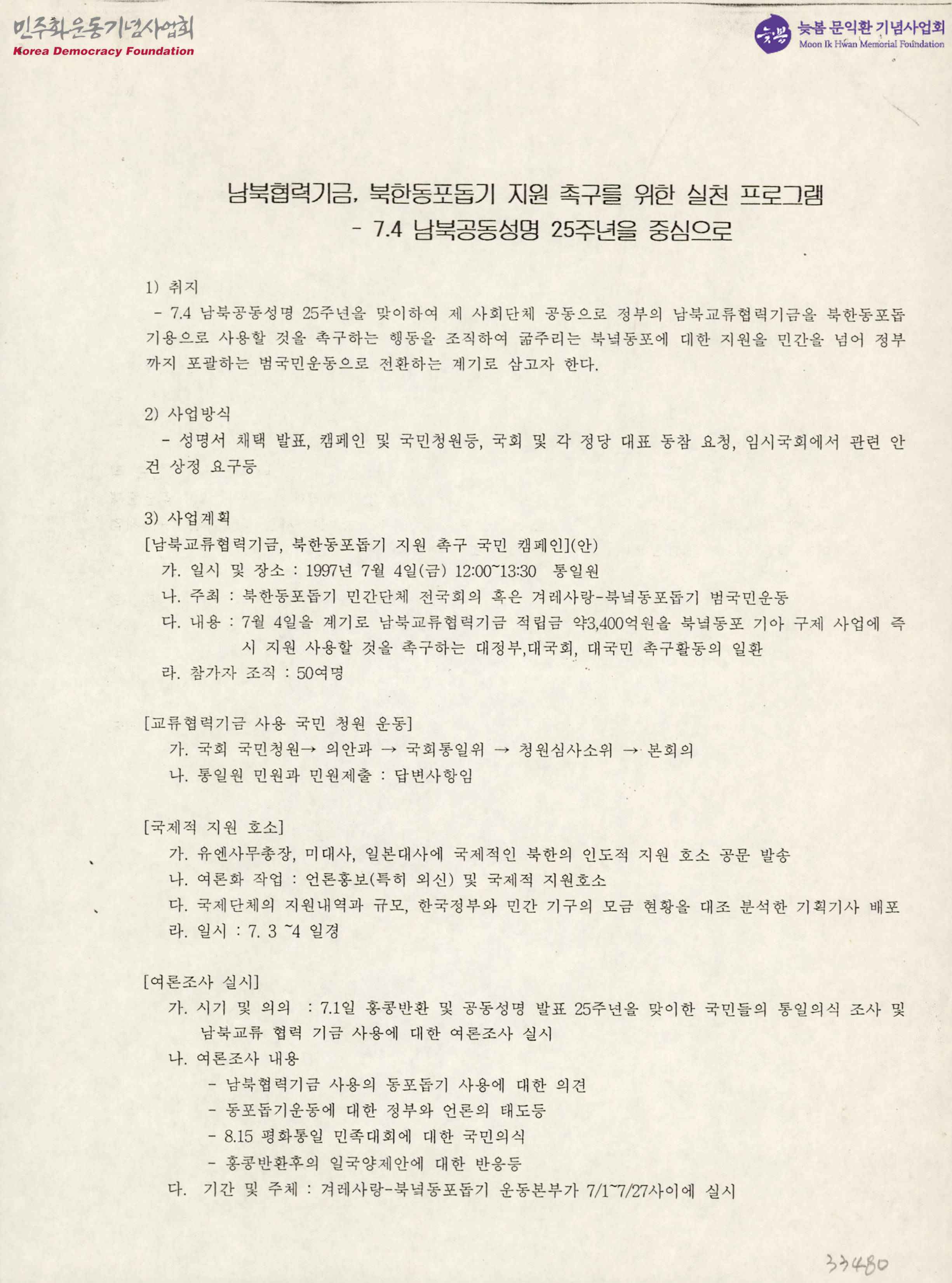 남북협력기금 북한동포돕기 지원 촉구를 위한 실천 프로그램-7.4남북공동성명 25주년을 중심으로