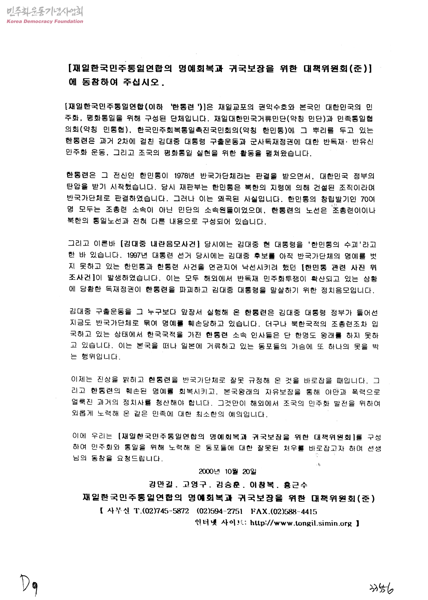 재일한국민주통일연합의 명예회복과 귀국보장을 위한 대책위원회(준)에 동참하여 주십시오