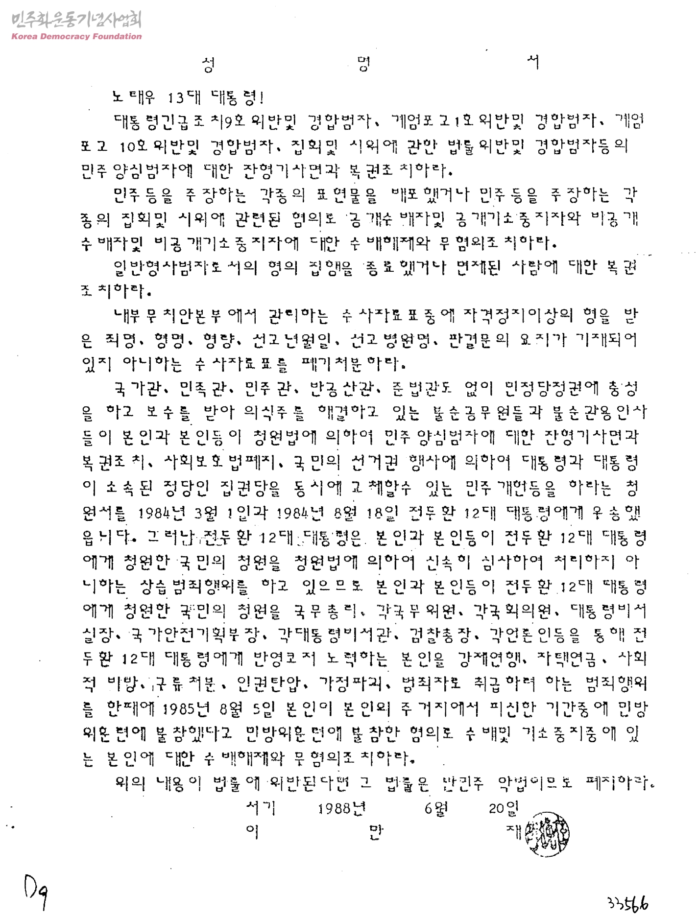 성명서-민주양심범자에 대한 잔형기사면과 복권조치하라