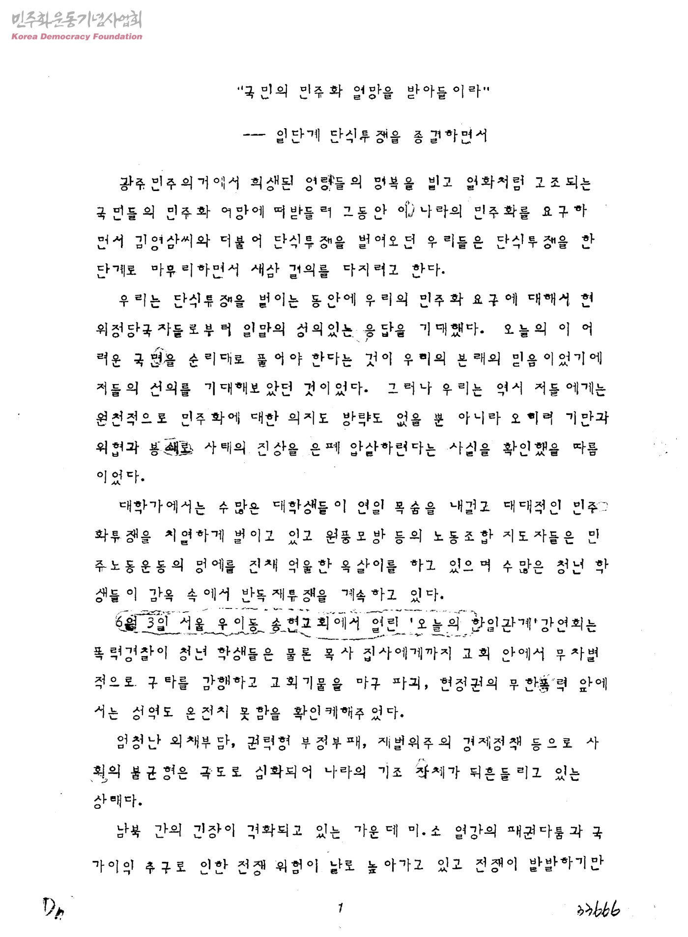 국민의 민주화 열망을 받아들이라-일단계 단식투쟁을 종결하면서