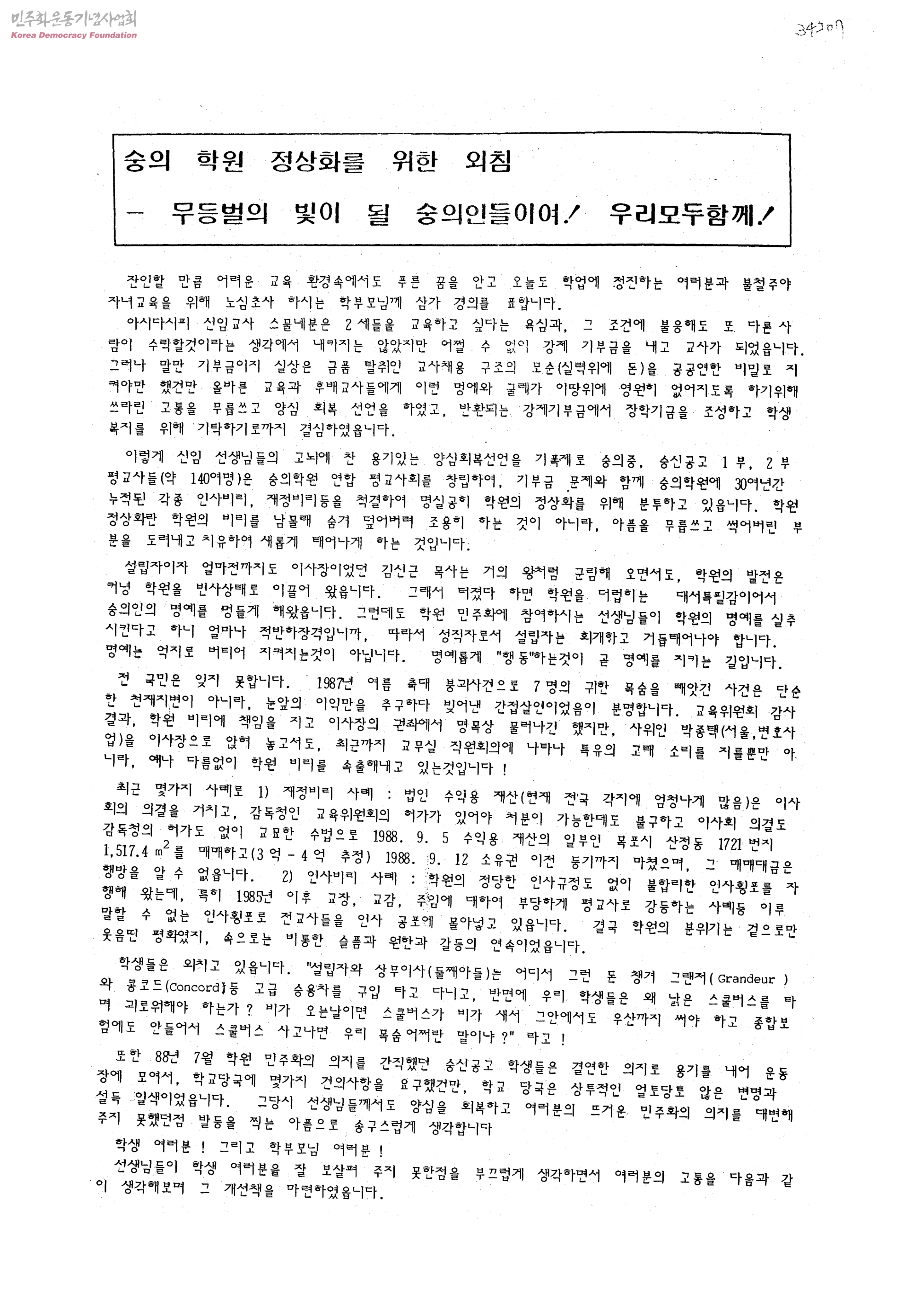숭의 학원 정상화를 위한 외침 -무등벌이 빛이 될 숭의인들이여! 우리모두함께!