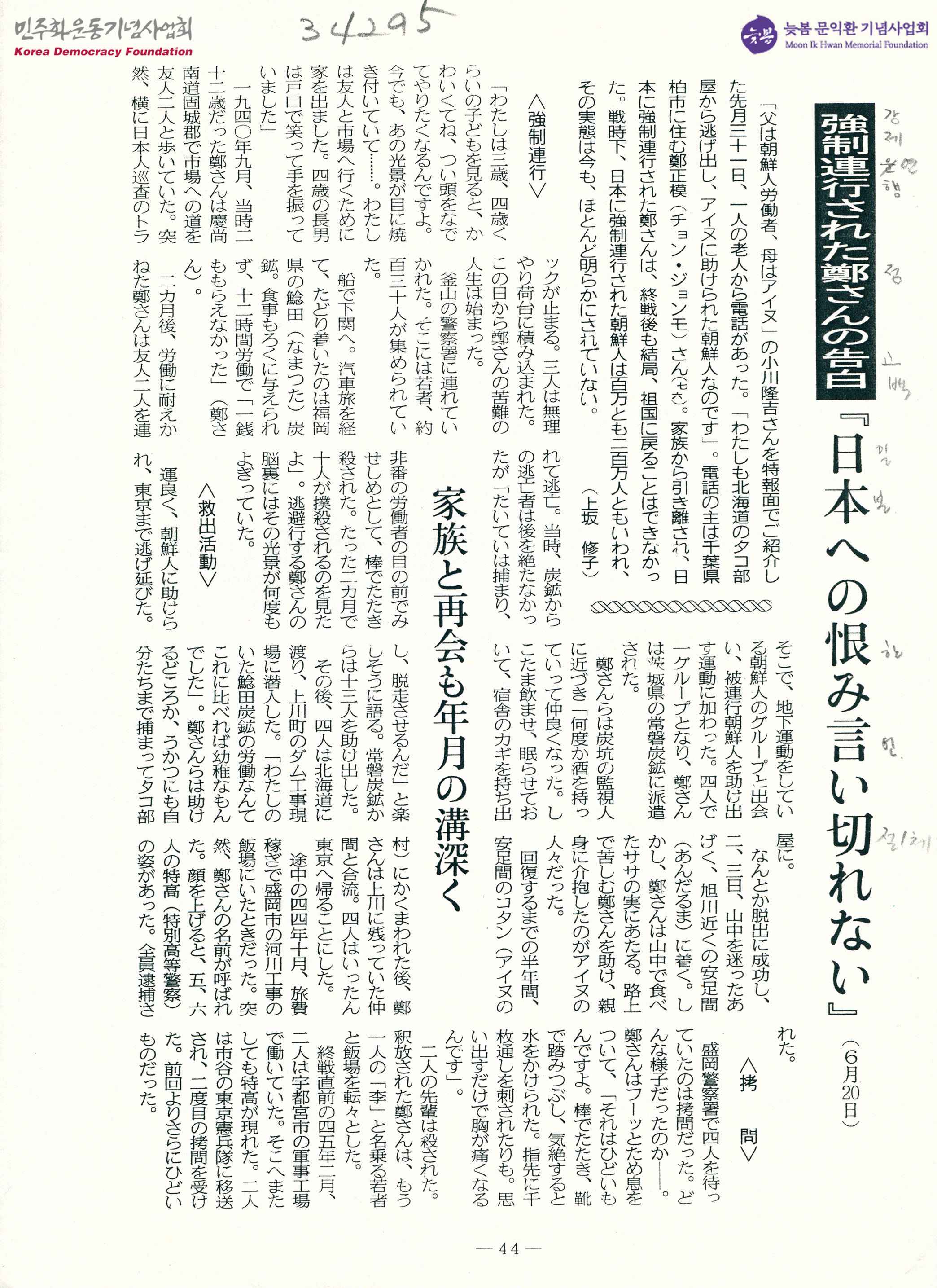 强制連行さわ鄭さんの告白 '日本への恨み言い切れない