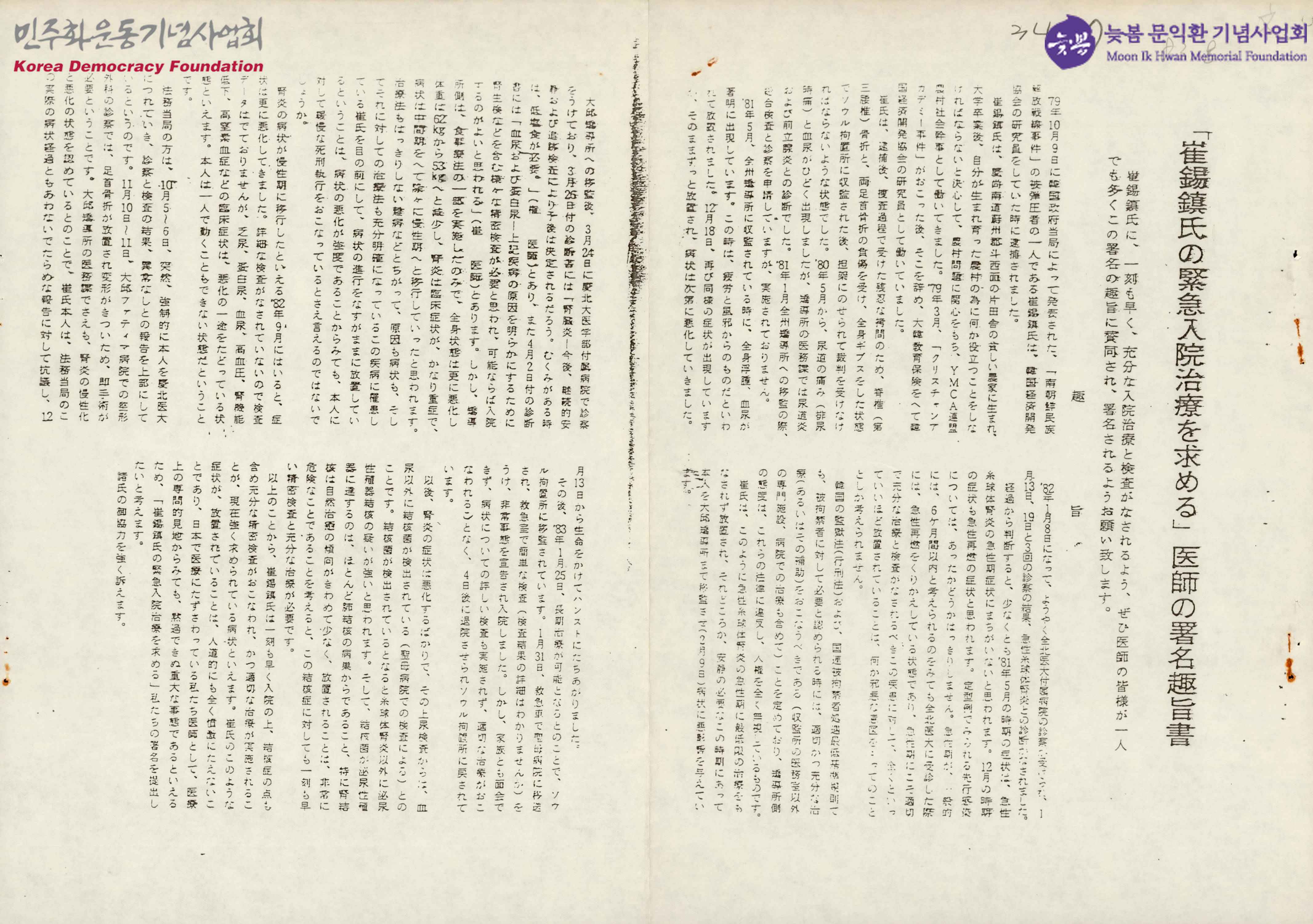 '崔錫鎭氏緊急入院治療を求める' 醫師の署名趣旨書