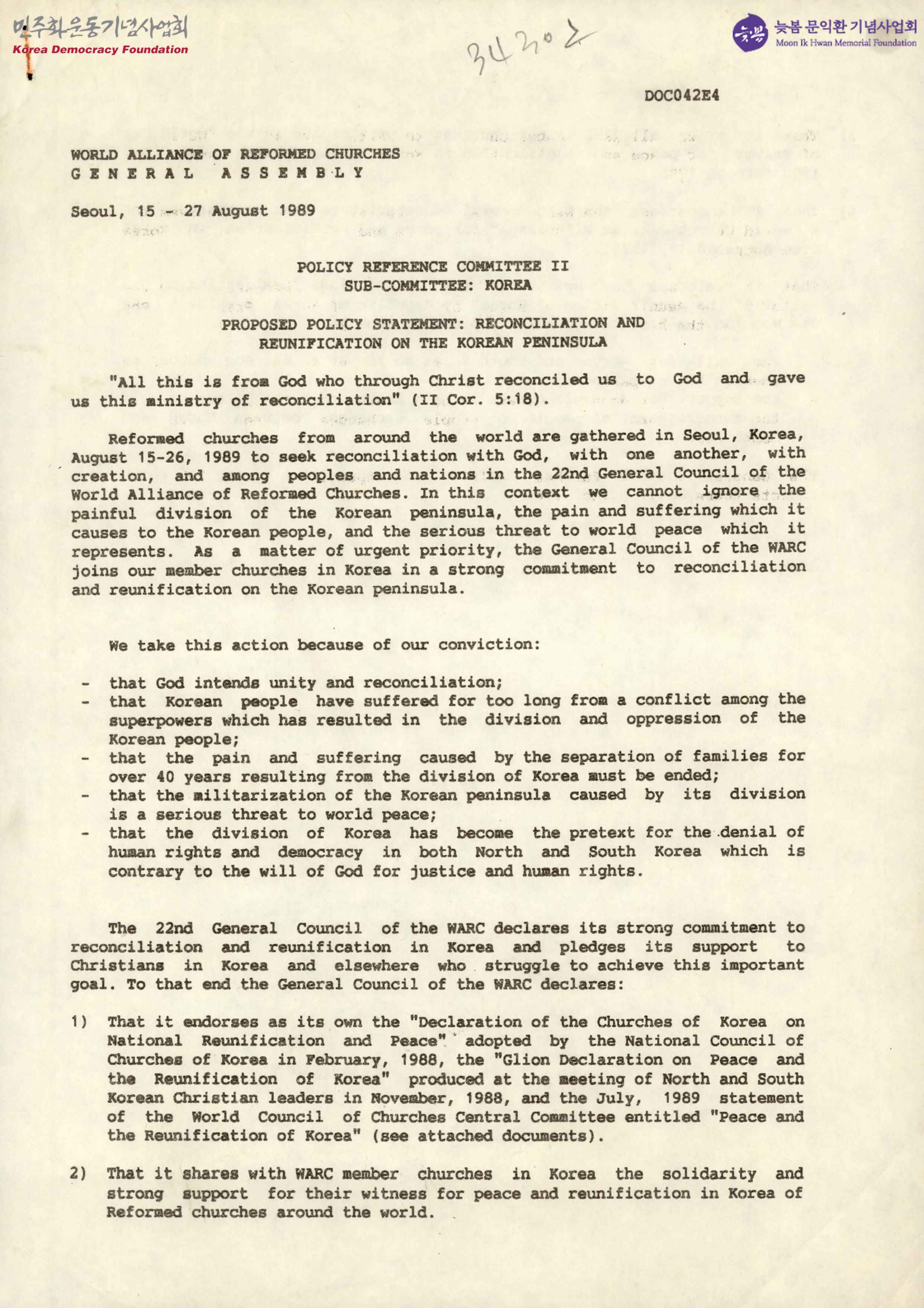 POLICY REFERENCE COMMITTEE∥SUB-COMMITTEE:KOREA/PROPOSED POLICY STATEMENT:RECONCILIATON AND REUNIFICATION ON THE KOREAN