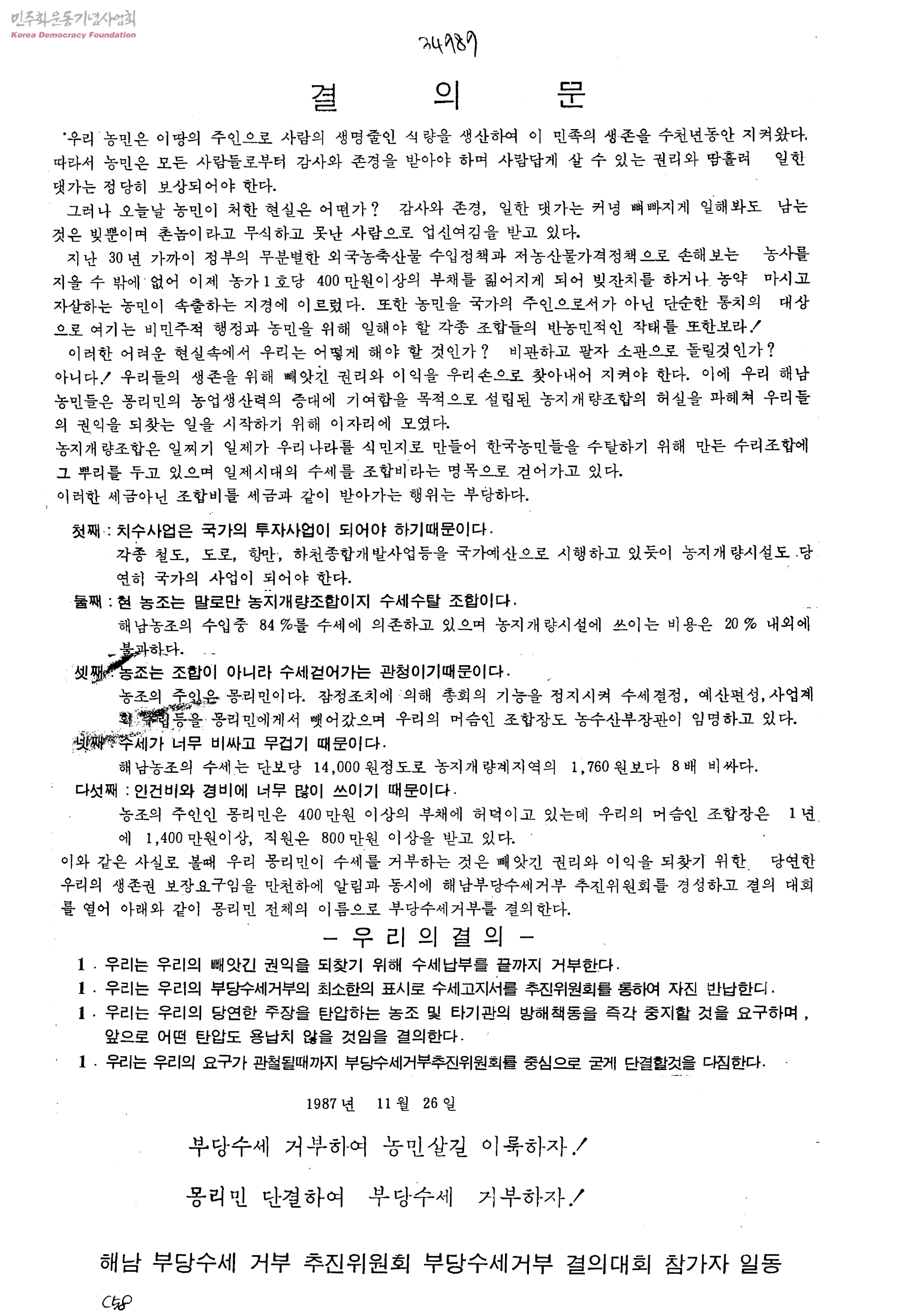 - 해남부당수세거부추진위원회부당수세거부결의대회참가자일동