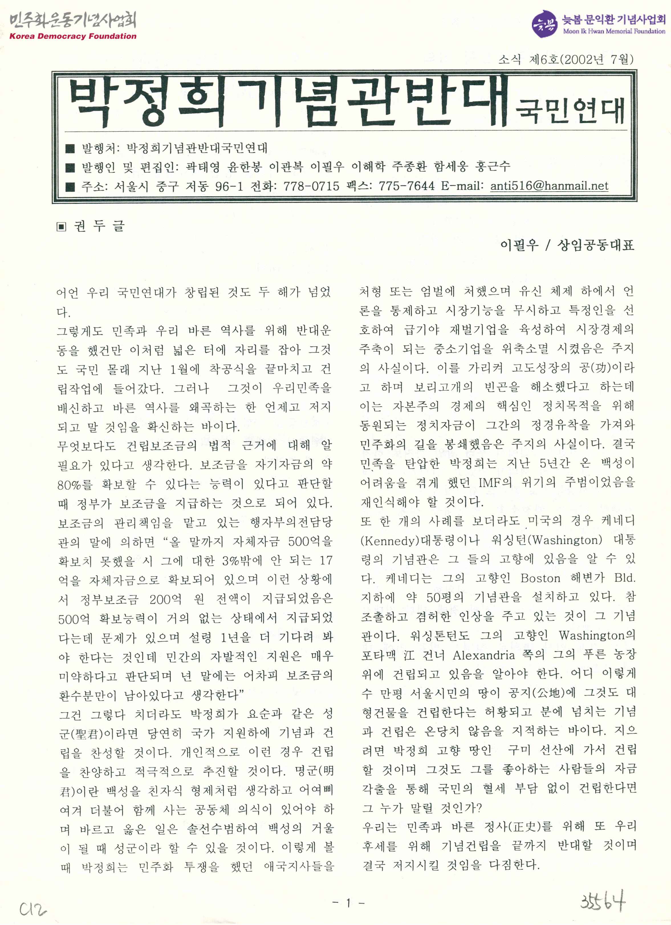 박정희 기념관 반대 국민연대 소식 제6호
