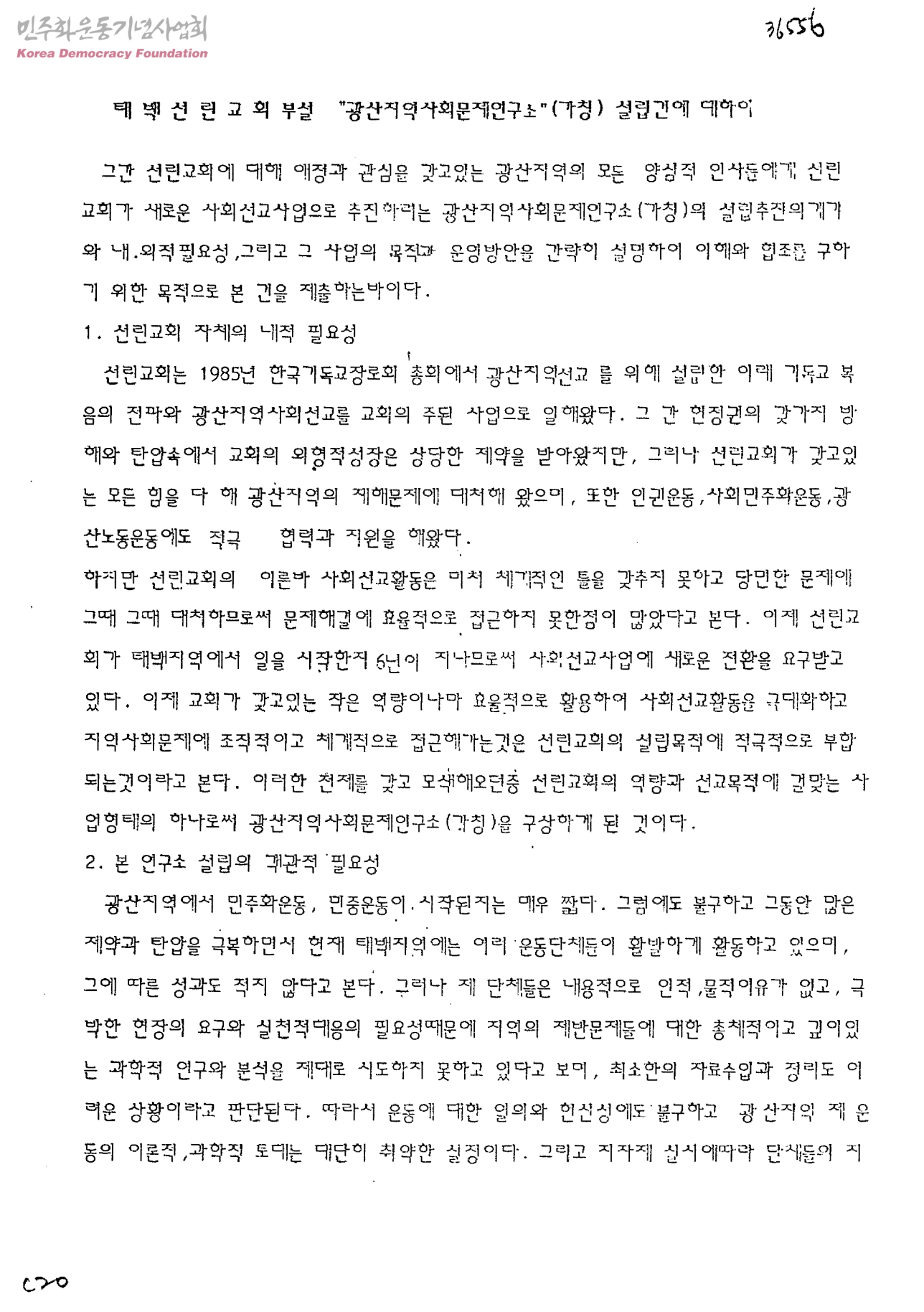 태백선린교회부설 광산지역사회문제연구소(가칭 )설립건에 대하여