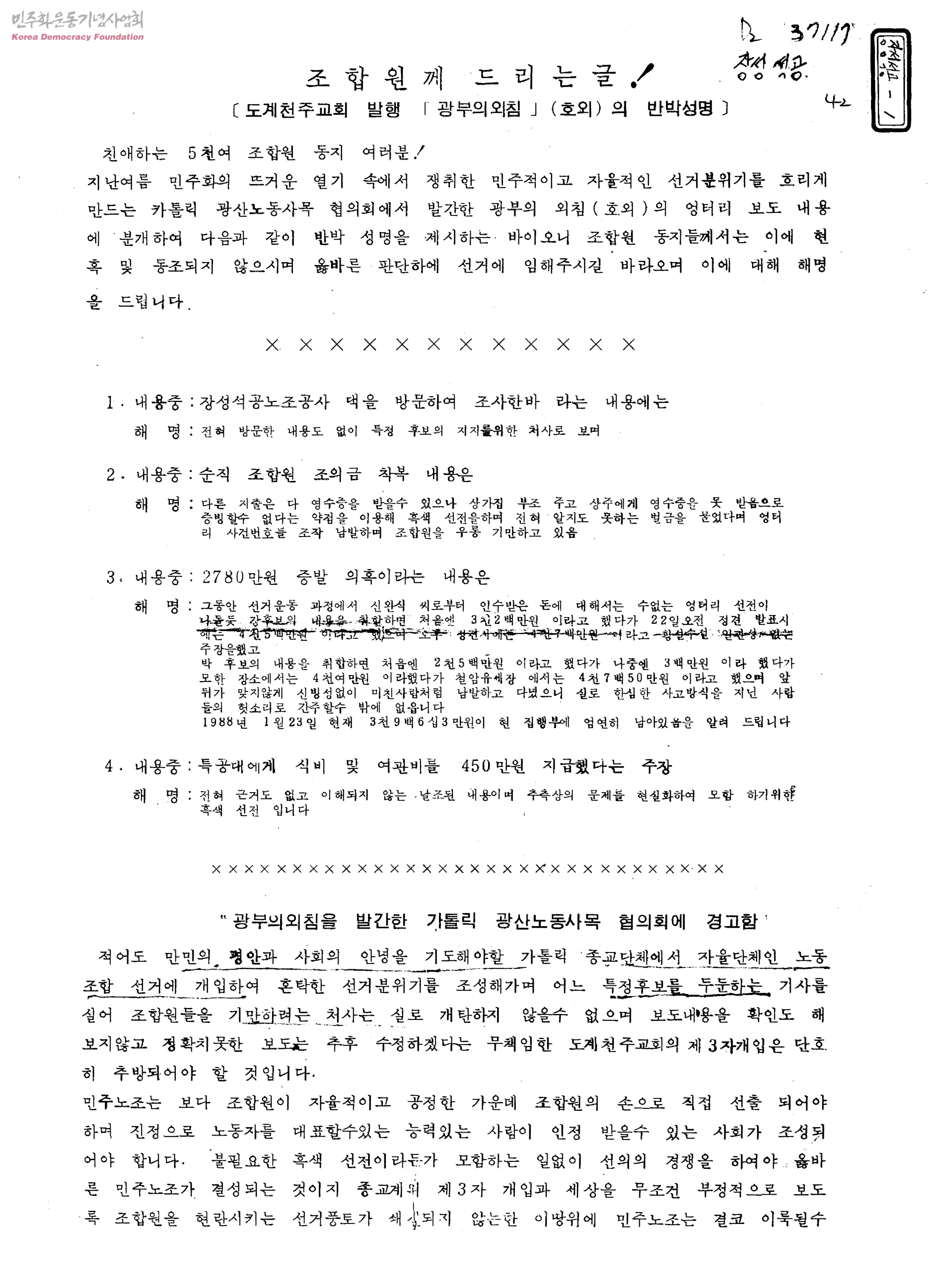 조합원께 드리는 글!-도계천주교회 발행 '광부의외침'(호외)의 반박성명