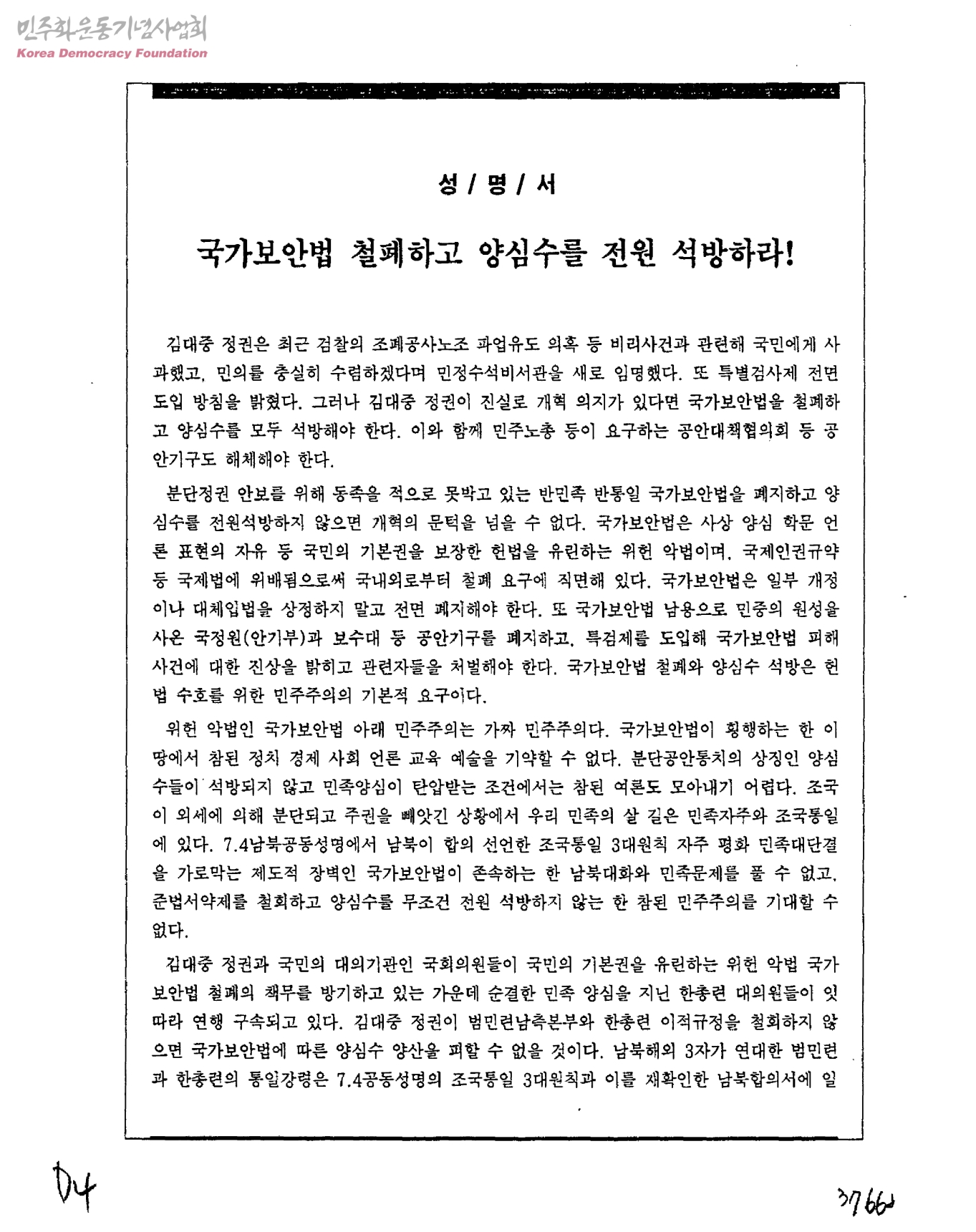 성명서-국가보안법 철폐하고 양심수를 전원 석방하라