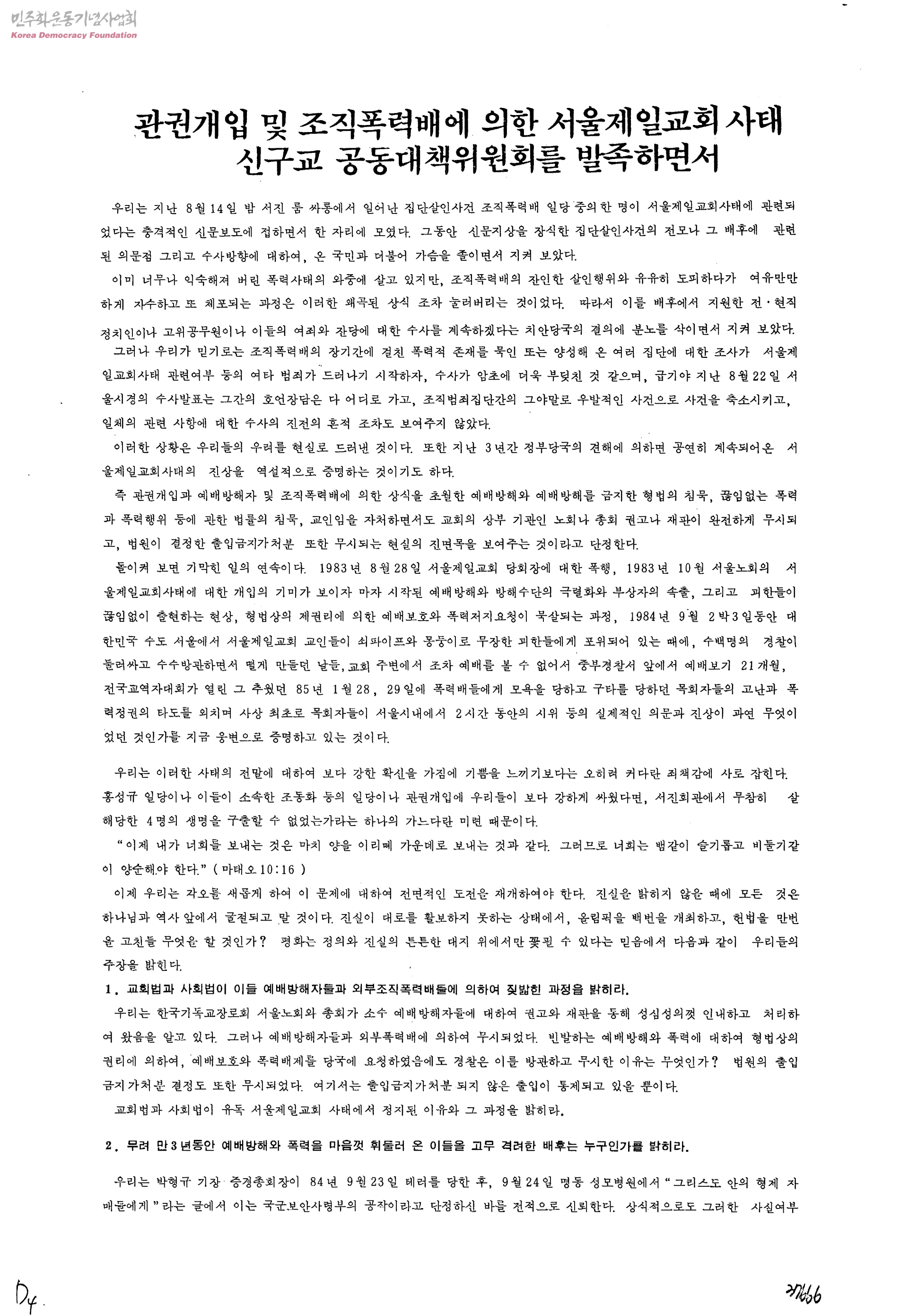 - 관권개입및조직폭력배에의한서울제일교회사태신구교공동대책위원회