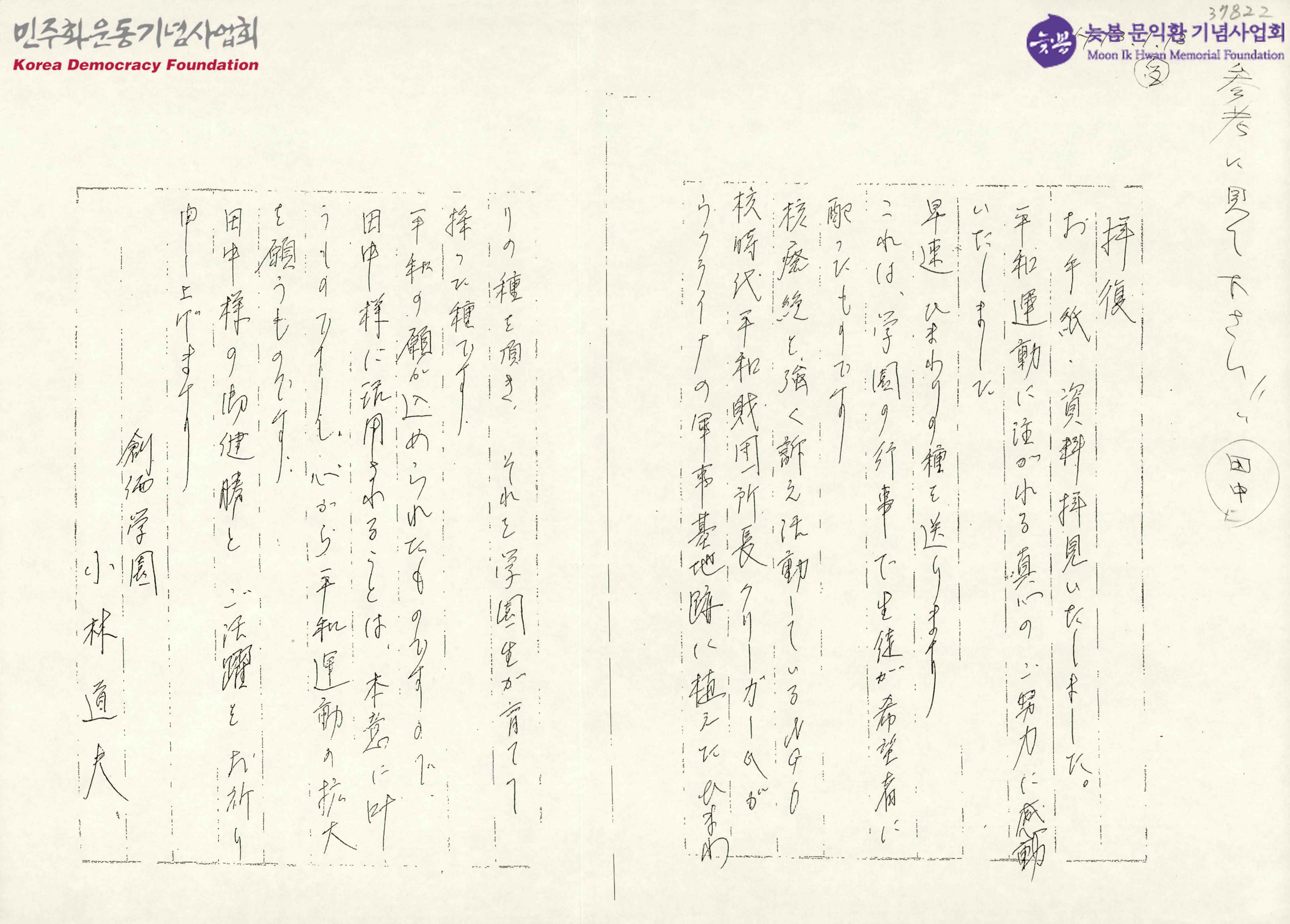 [創?學園의 小林道夫가 田中에게 보내는 편지]