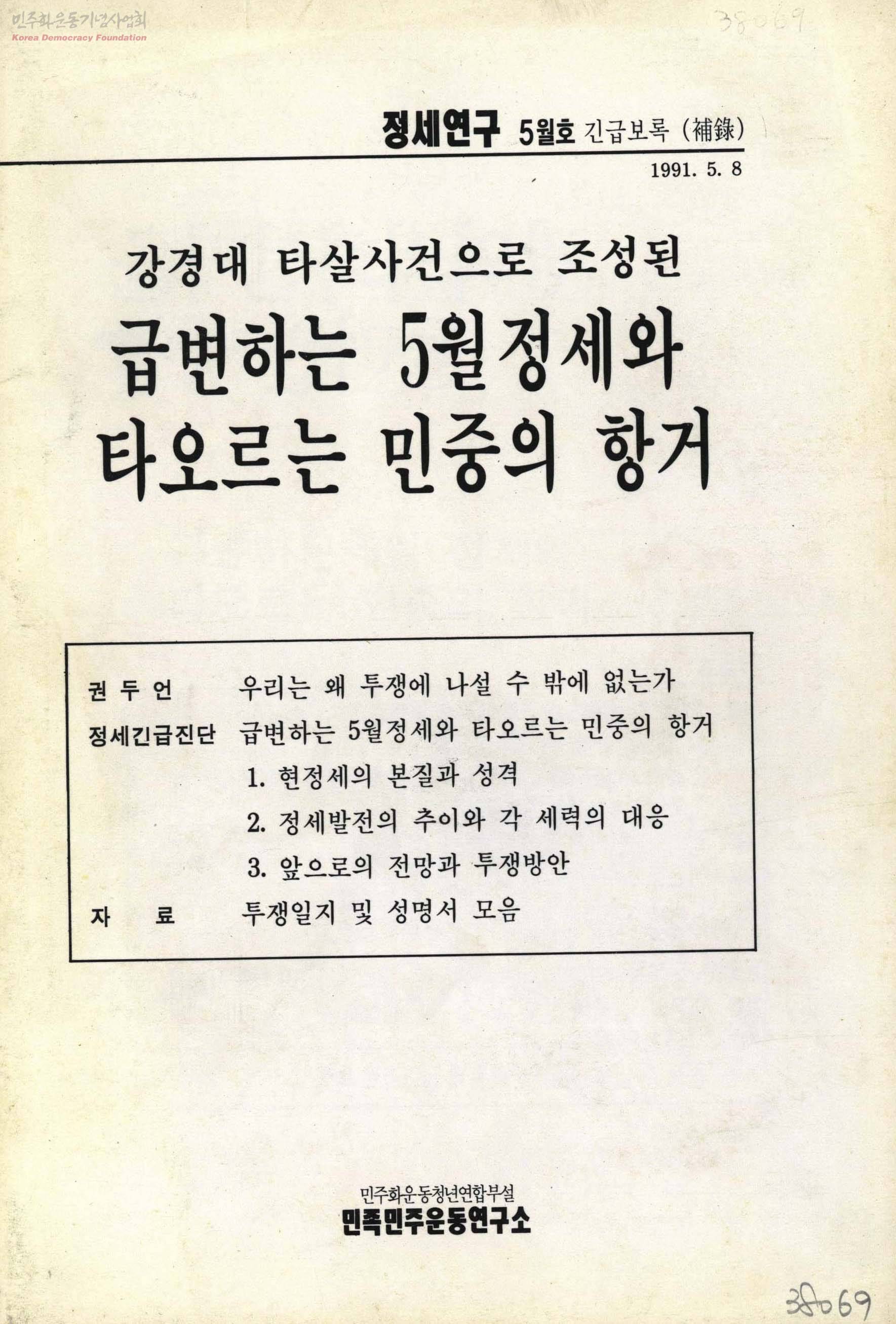 - 우리는 왜 투쟁에 나설 수 밖에 없는가 급변하는 5월정세와 타오르는 민중의 항거 현 정세의 본질과 성격 정세 발전의 추이와 각 세력의 대응 앞으로의 전망과 투쟁방안 투쟁일지 및 성명서 모음