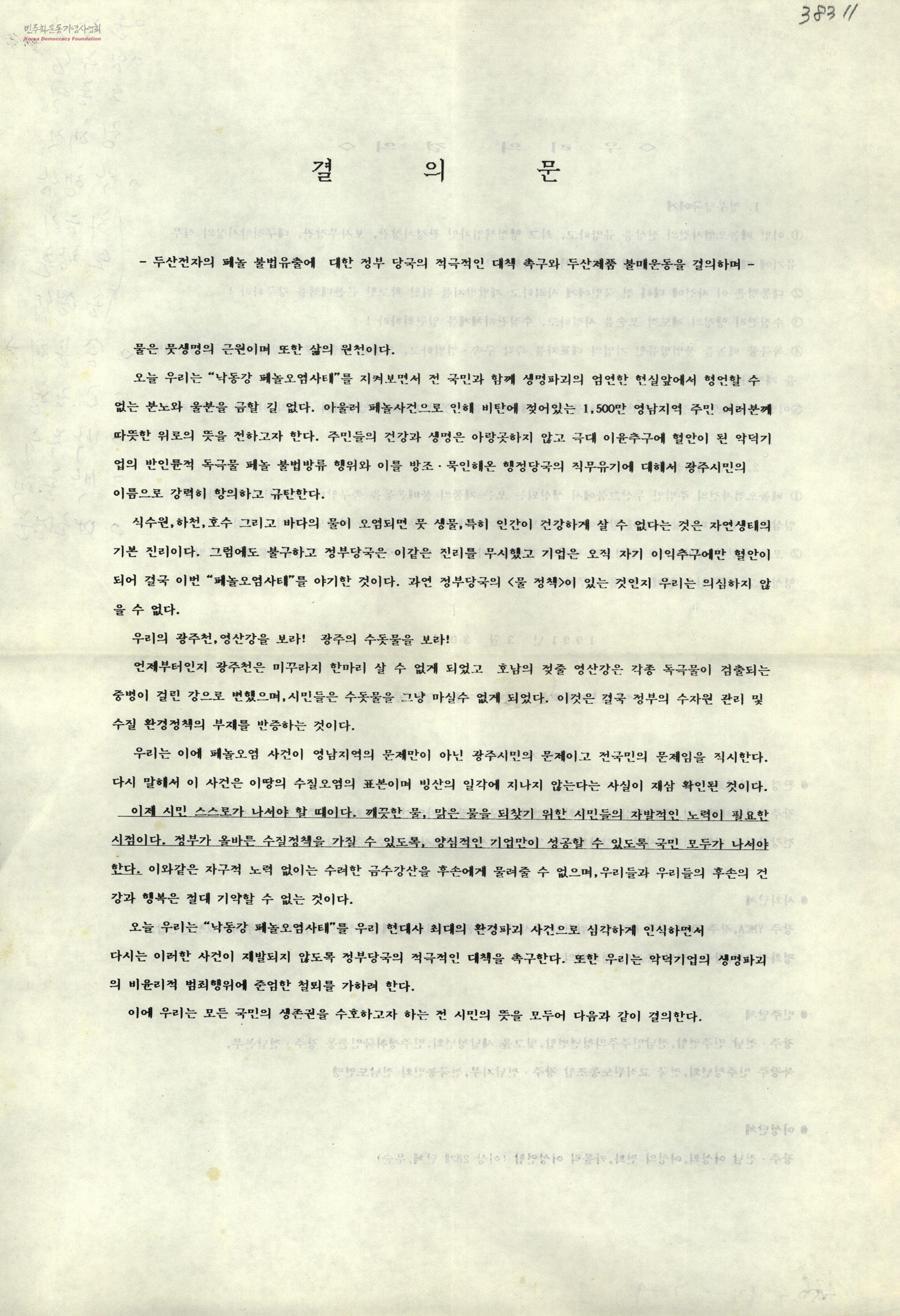 두산전자의 페놀 불법유출에 대한 정부 당국의 적극적인 대책 촉구와 두산제품 불매운동을 결의하며
