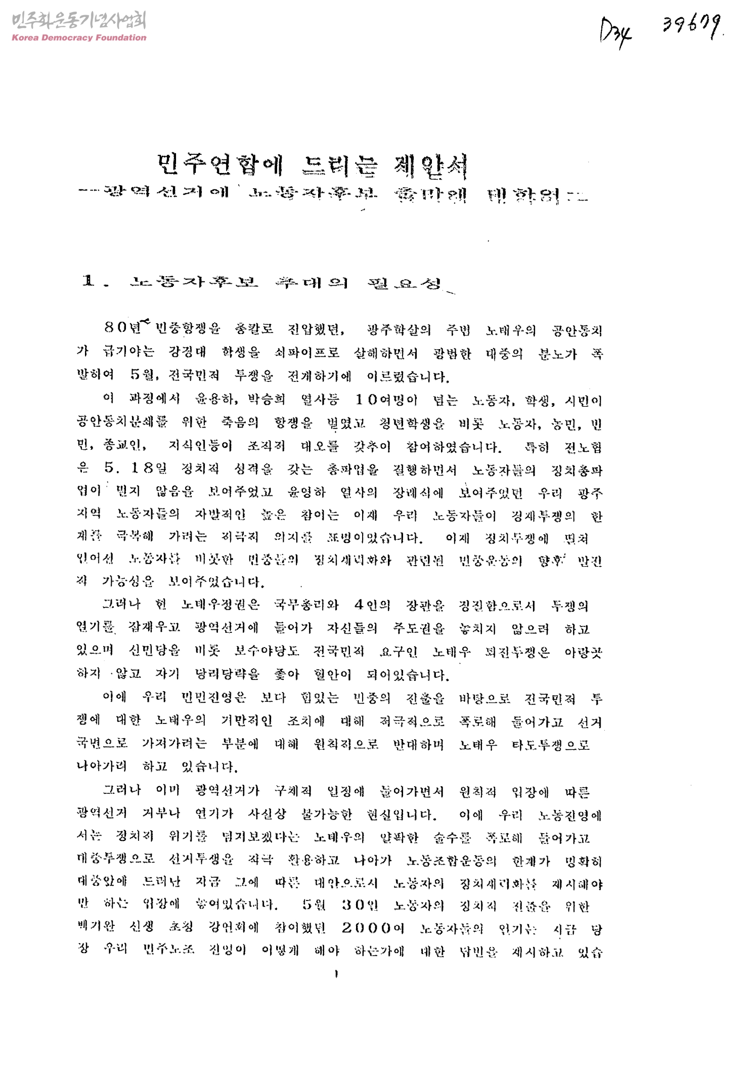 민주연합에 드리는 제안서-광역선거에 노동자후보 출마에 대하여