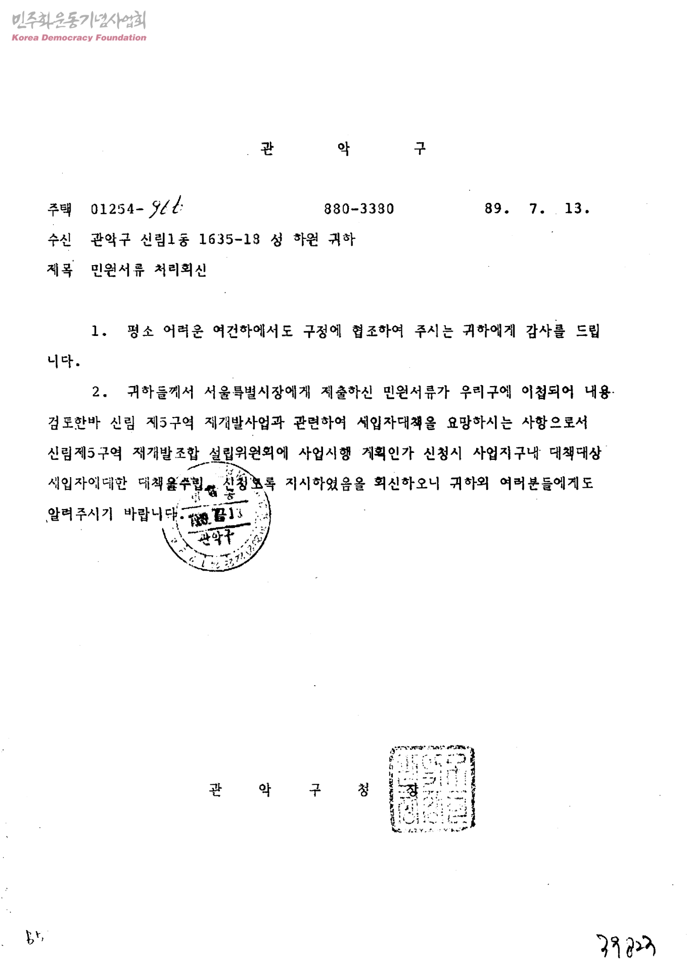 민원서류 처리회신[수신:관악구 신림1동 1635-18 성하원]